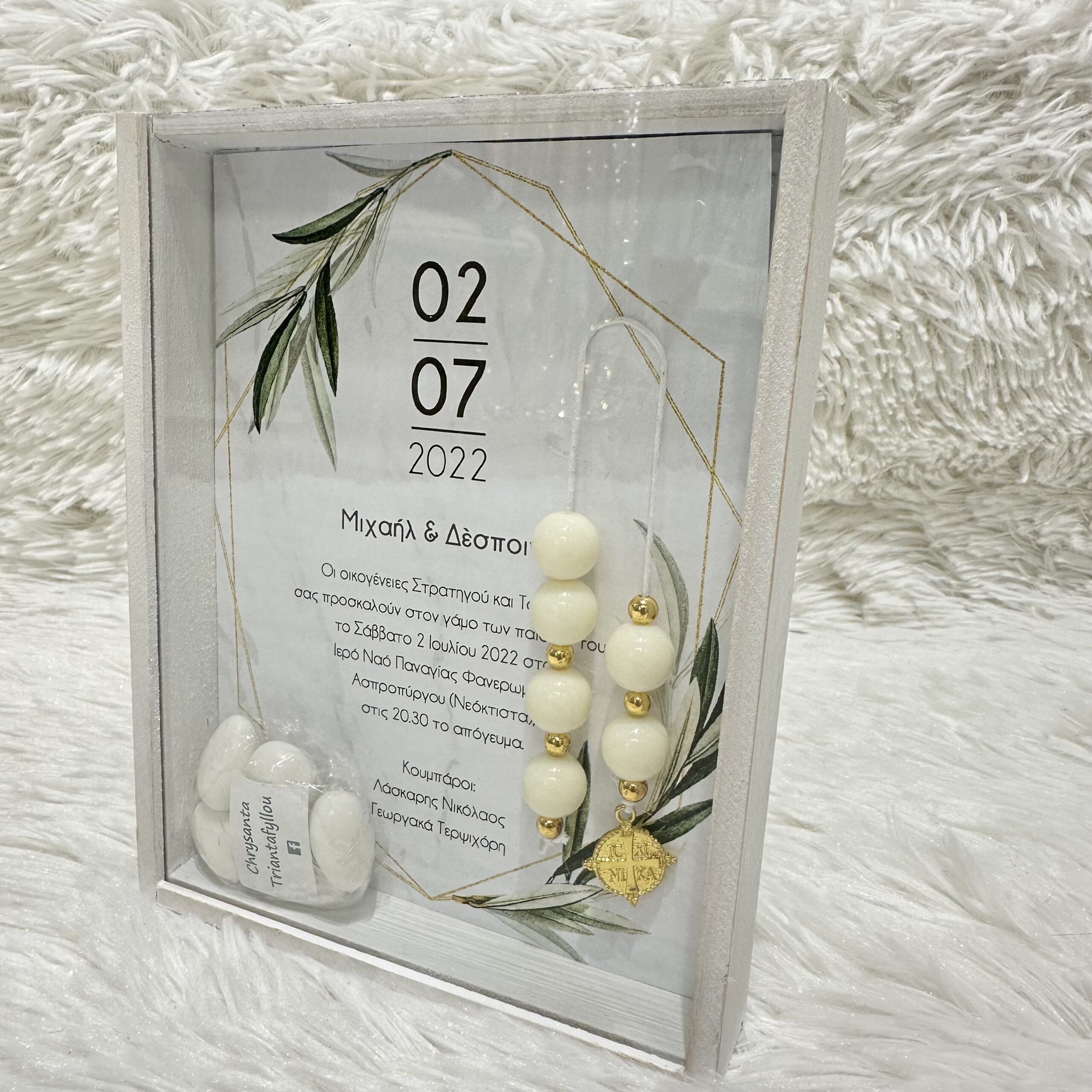 Μπομπονιέρα – προσκλητήριο μπεγλέρι γούρι με κωνσταντινάτο. Σε ξύλινο κουτί με plexi glass καπάκι. Διαλέξτε προσκλητήριο με το θέμα της επιλογής σας
