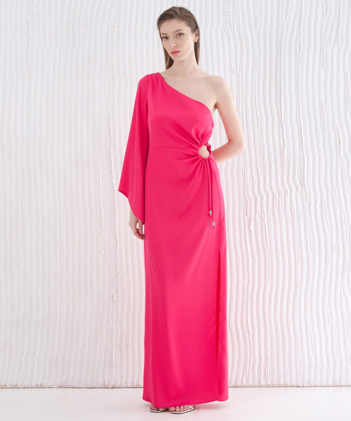 Φόρεμα σατέν μακρύ με ένα μανίκι. Άνοιγμα στη μέση με κορδόνι και διακοσμητικά τελειώματα. Άνοιγμα στην πλαϊνή. Φερμουάρ πίσω.