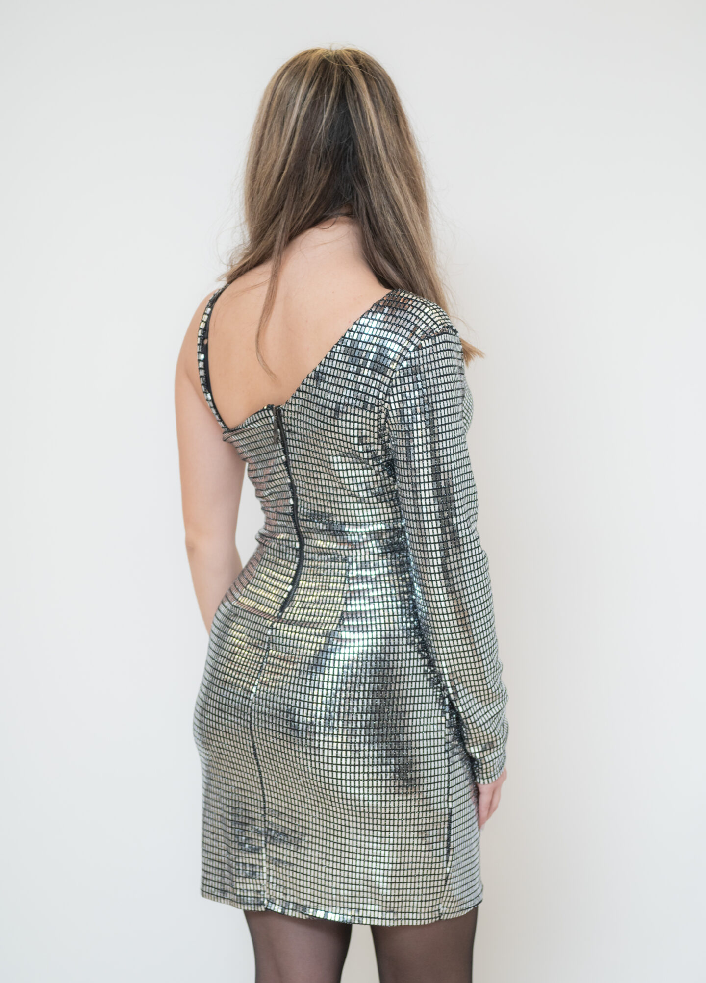 Μini φόρεμα παγιέτα με έναν ώμο. Εχει ένα μακρύ μανίκι και ένα τιραντακι. Υπάρχει σε ασημί και σε κόκκινο χρώμα