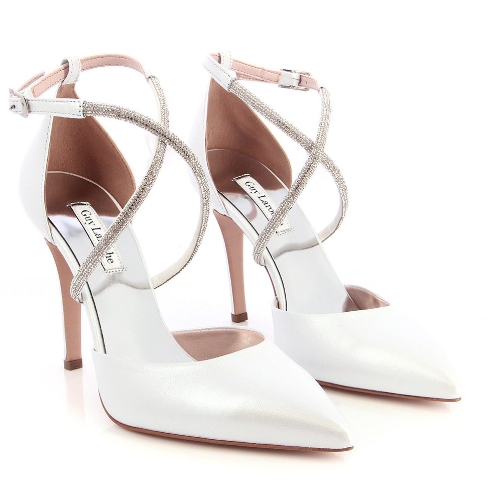 Νυφικά παπούτσια Guy Laroche σε λευκό περλέ. Πέδιλο από γνήσιο δέρμα και στρας εξωτερικά και γνήσιο δέρμα εσωτερικά. Ύψος τακουνιού 10cm. Χειροποίητα Ελληνικής ραφής.