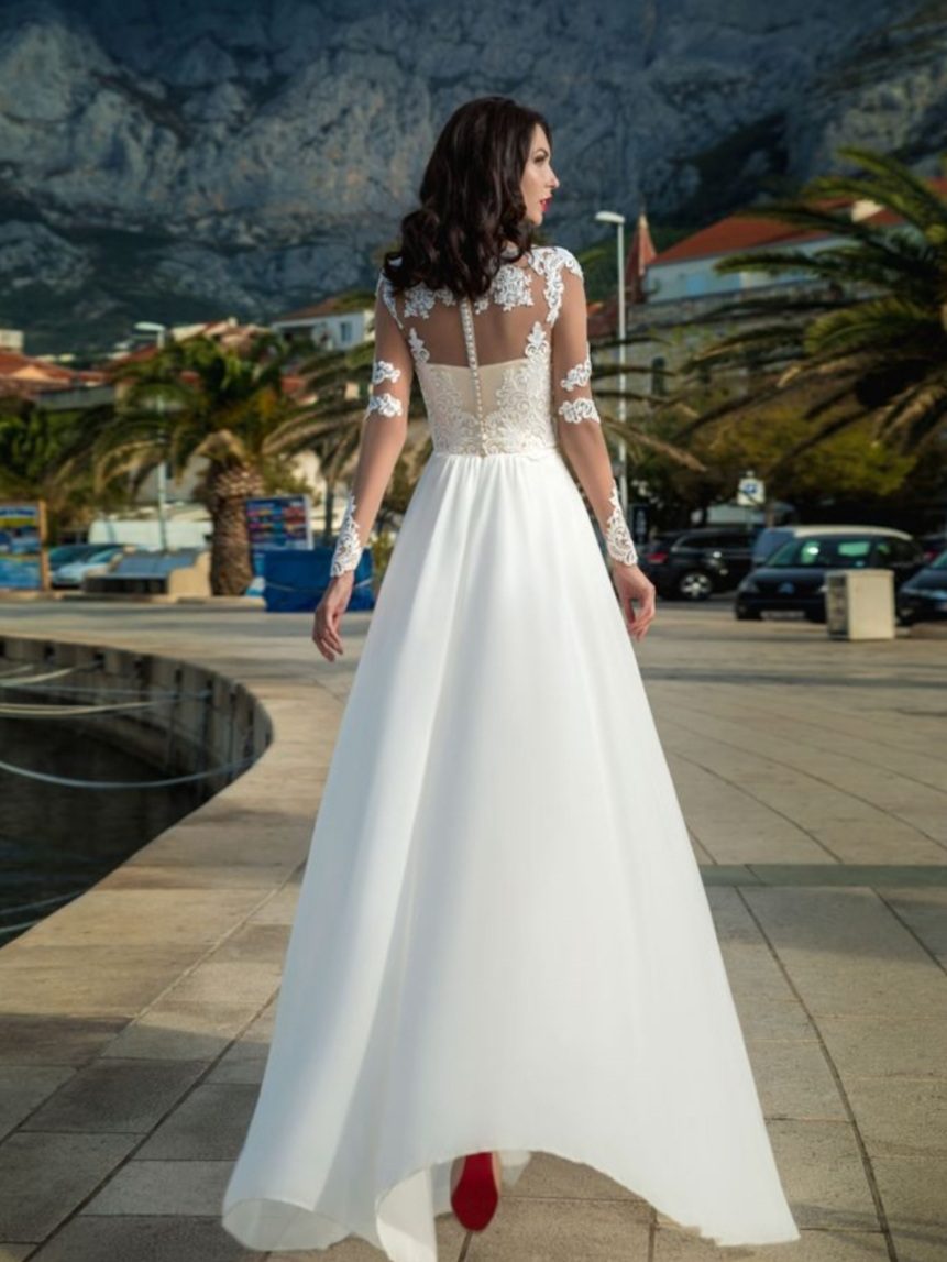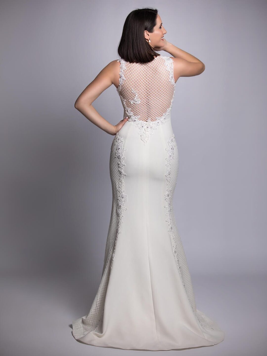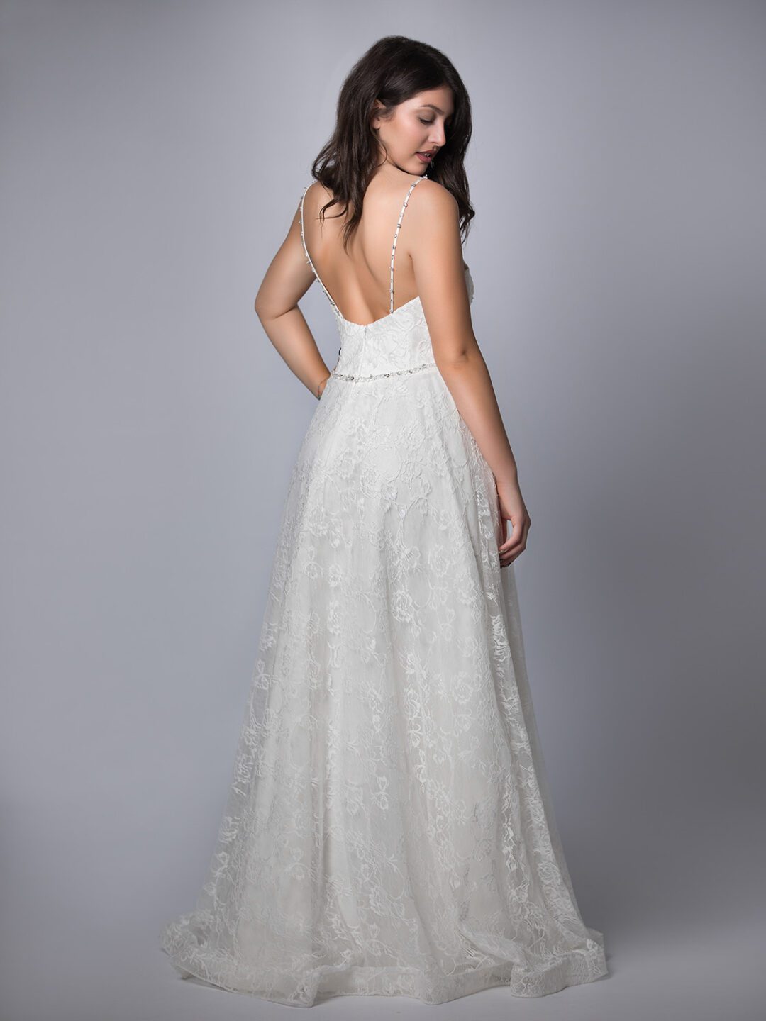 Ρομαντικό nυφικό με κεντημένη δαντέλα και ανοιχτή πλάτη. Μπούστο V με soleil διαφάνεια, τιράντες και V πλάτη ανοιχτή μέχρι τη μέση, σε άλφα γραμμή. Διακοσμημένο με στρας στη μέση, στο μπούστο και τους ώμους. Κανονική εφαρμογή.