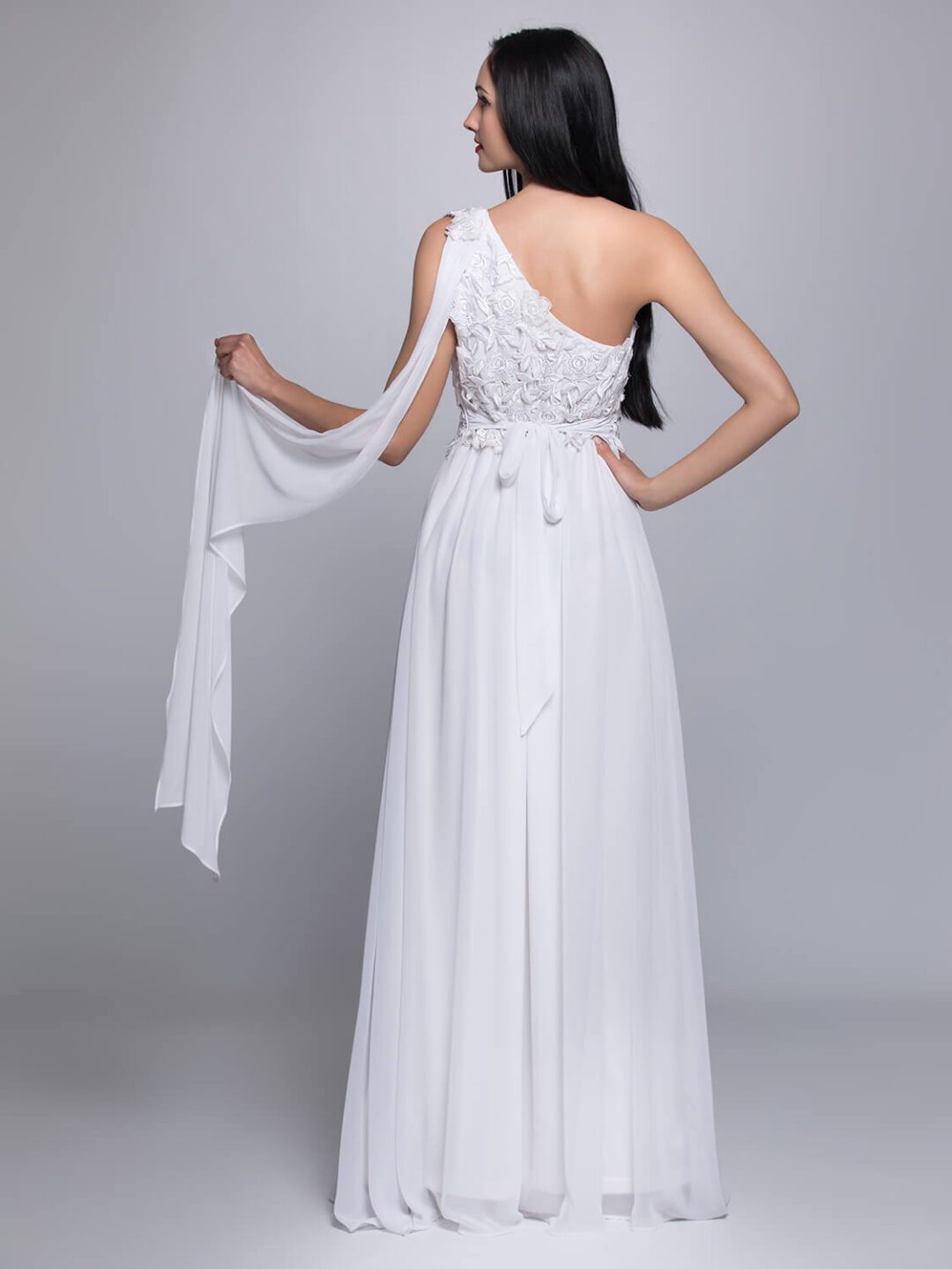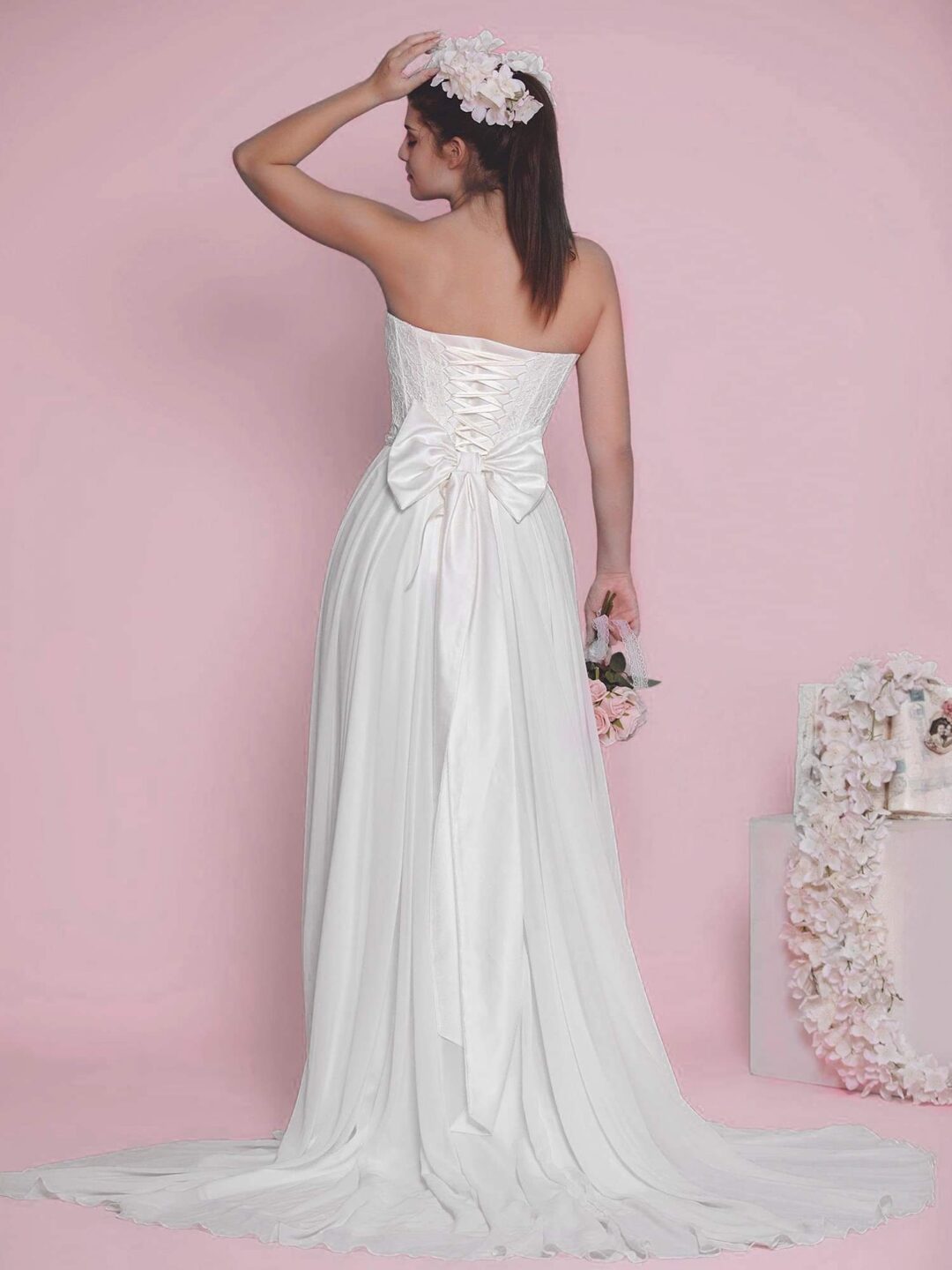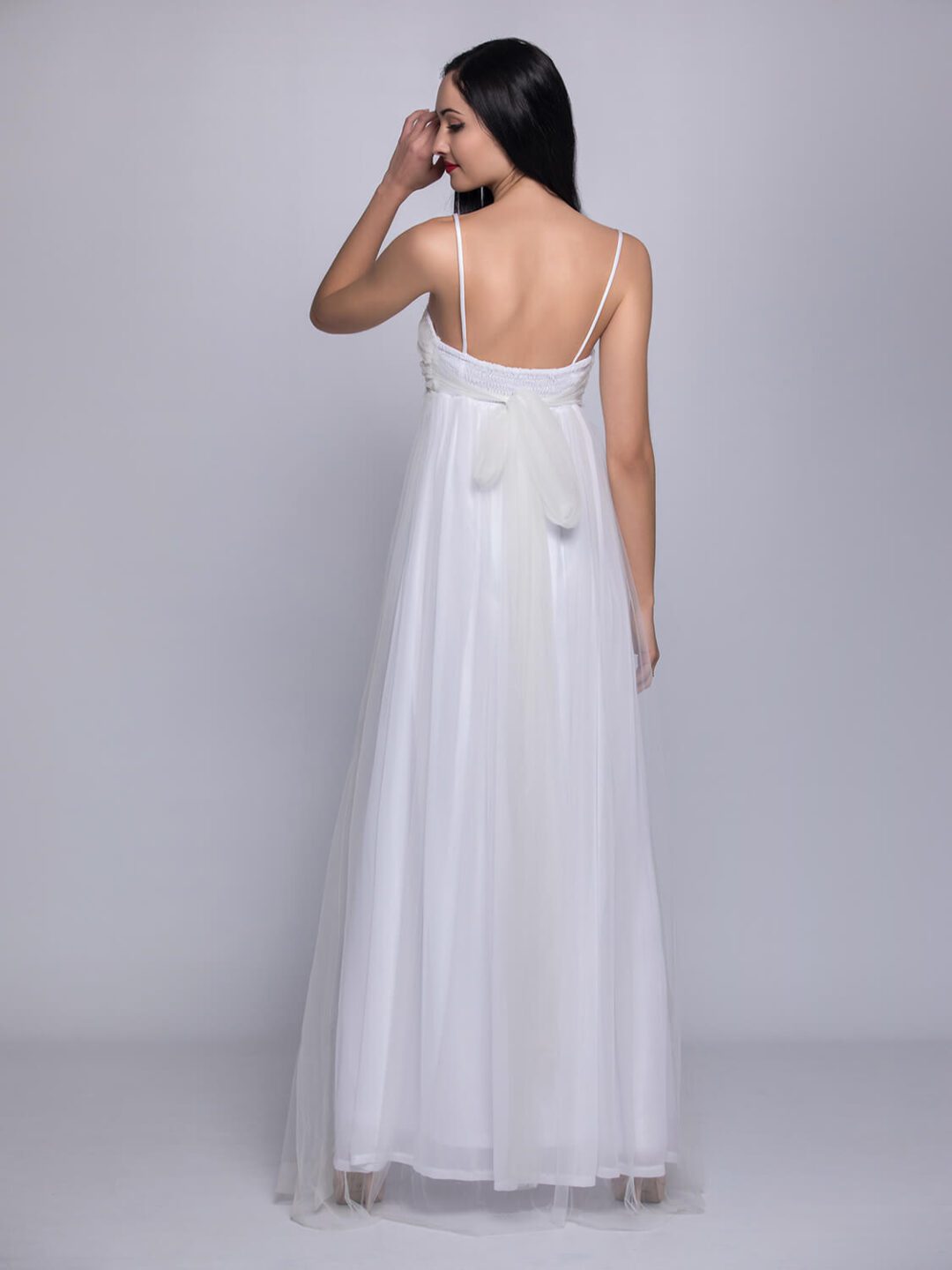 Ρομαντικό nυφικό με κεντημένη δαντέλα και ανοιχτή πλάτη. Μπούστο V με soleil διαφάνεια, τιράντες και V πλάτη ανοιχτή μέχρι τη μέση, σε άλφα γραμμή. Διακοσμημένο με στρας στη μέση, στο μπούστο και τους ώμους. Κανονική εφαρμογή.