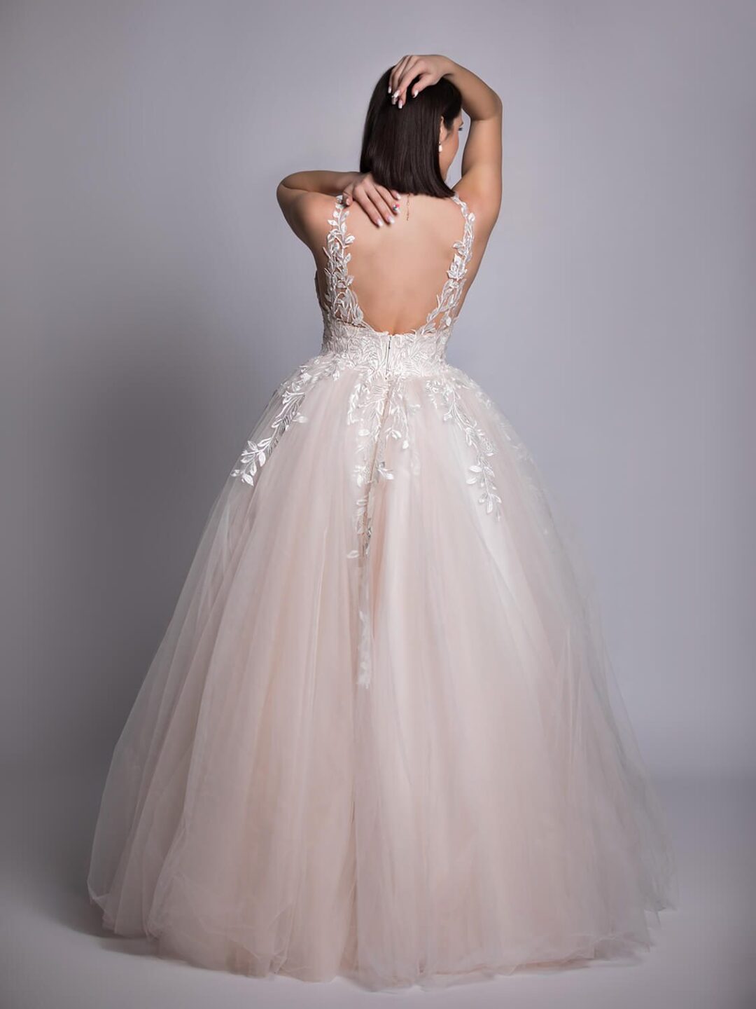 Νυφικό ολομέταξο με δαντέλα σε άλφα γραμμή, με ολοκέντητο μπούστο από 3D δαντέλα και παγιέτα, πλάτη με χιαστή δέσιμο σε off white χρώμα. Καλύπτει νούμερα M/L.