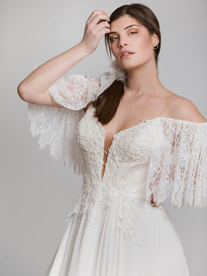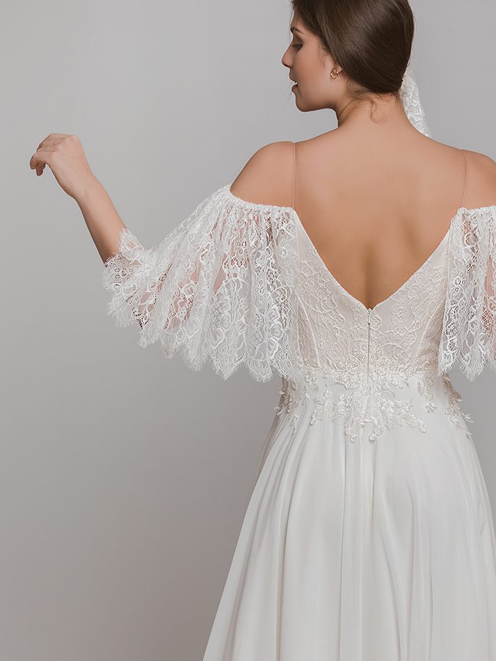 Νυφικό σε άλφα γραμμή από μεταξωτή μουσελίνα, με υπέροχο ρομαντικό boho χαρακτήρα, συνοδεύεται με δαντελένιο τρουακάρ μανίκι από ανάγλυφη γαλλική δαντέλα και υπέροχο μπούστο από κεντημένη δαντέλα, το οποίο αφήνει θηλυκά ακάλυπτα τους ώμους.