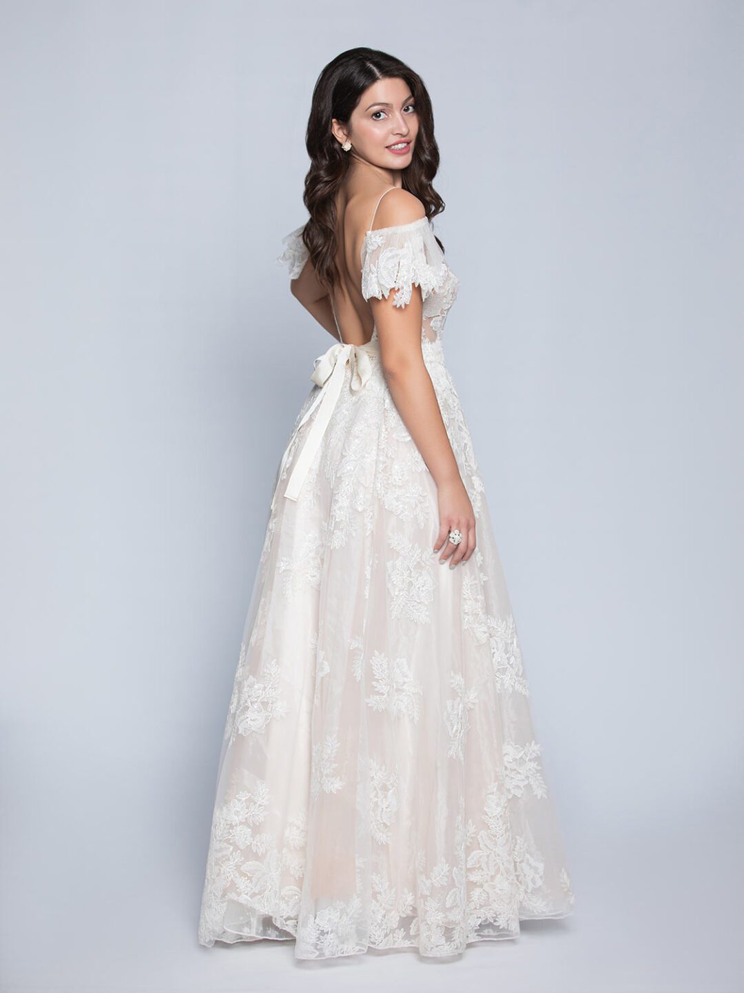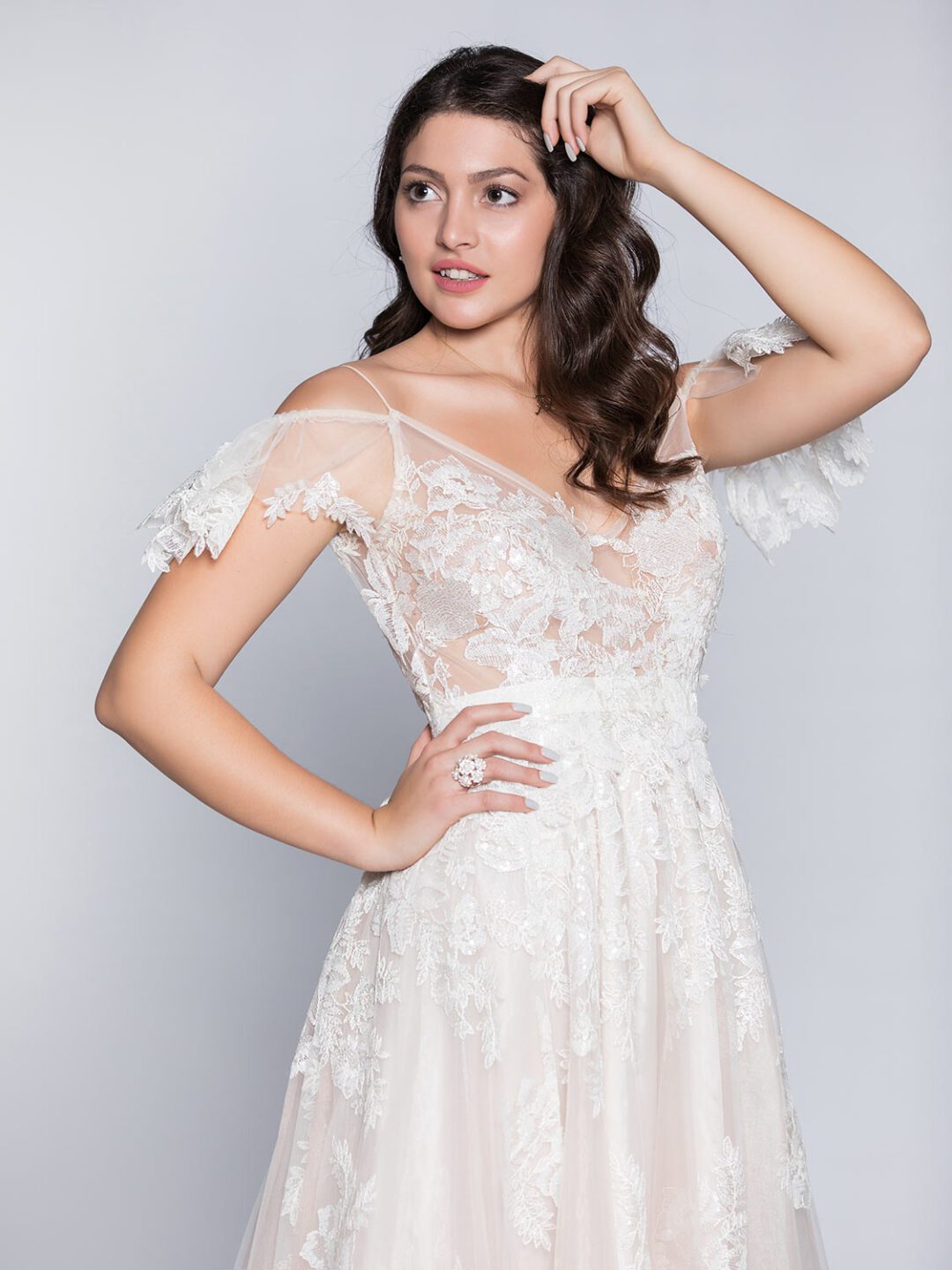 Νυφικό στο χρώμα της πούδρας, από γαλλική ανάγλυφη κεντημένη με παγιέτα δαντέλα στο χρώμα της πουδράς. Το νυφικό έχει κεντημένη διαφάνεια στο μπούστο, γαλλικό μανικάκι, V μπροστά και βαθύ V πίσω, με grow κορδέλα στο χρώμα της πούδρας.