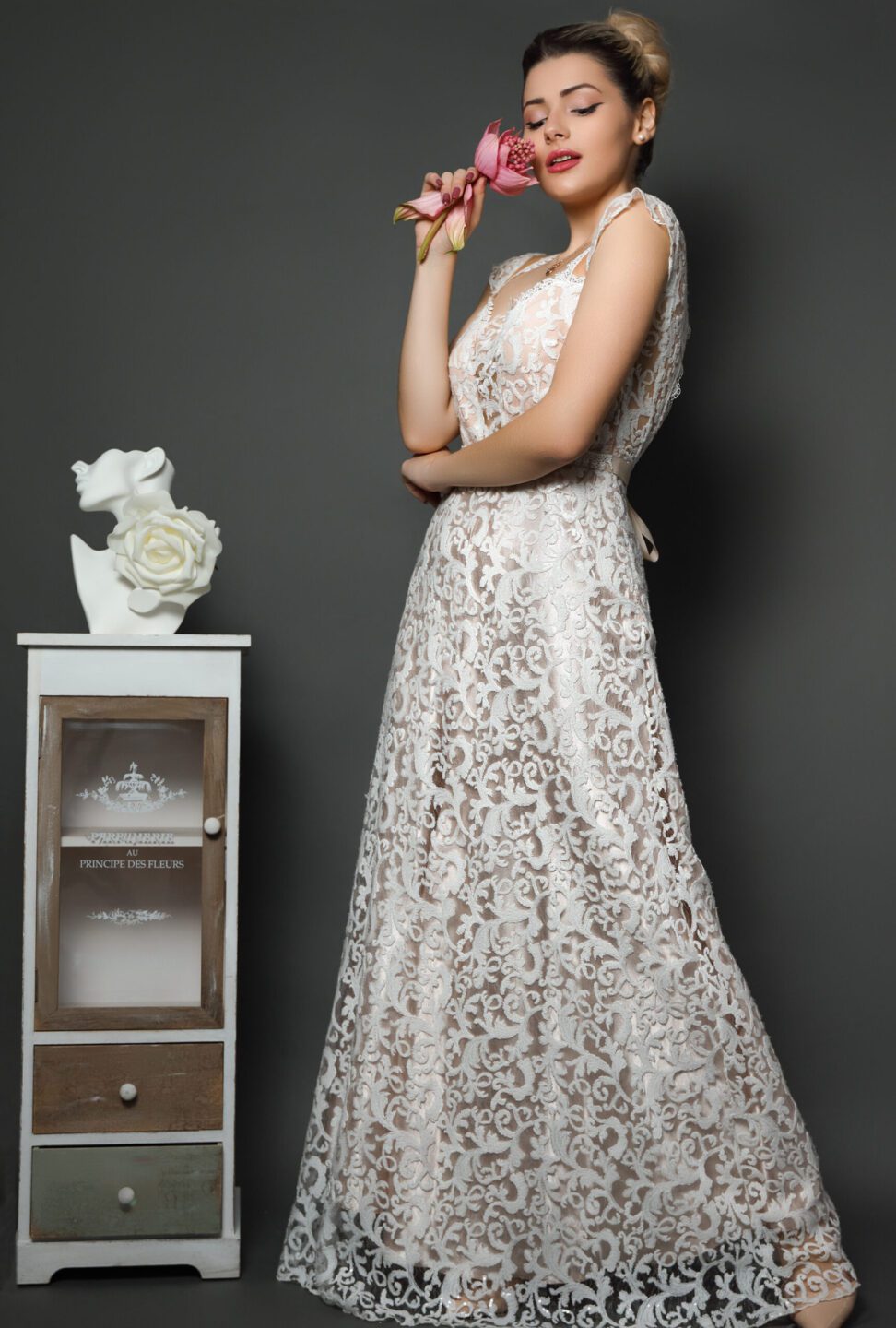 Νυφικό φόρεμα με ανάγλυφη δαντέλα και nude σατέν εσωτερικά. Σε άλφα γραμμή, με υπέροχη πλάτη και τιράντες δαντέλας. Κανονική εφαρμογή