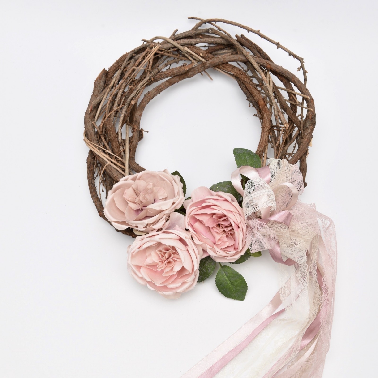 Ξύλινο στεφάνι με λουλούδια. Σε αποχρώσεις του ροζ. Διαστάσεις Φ35cm