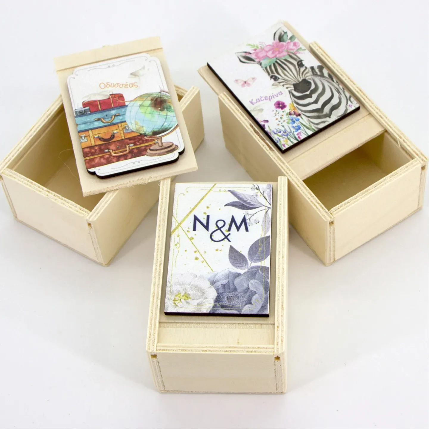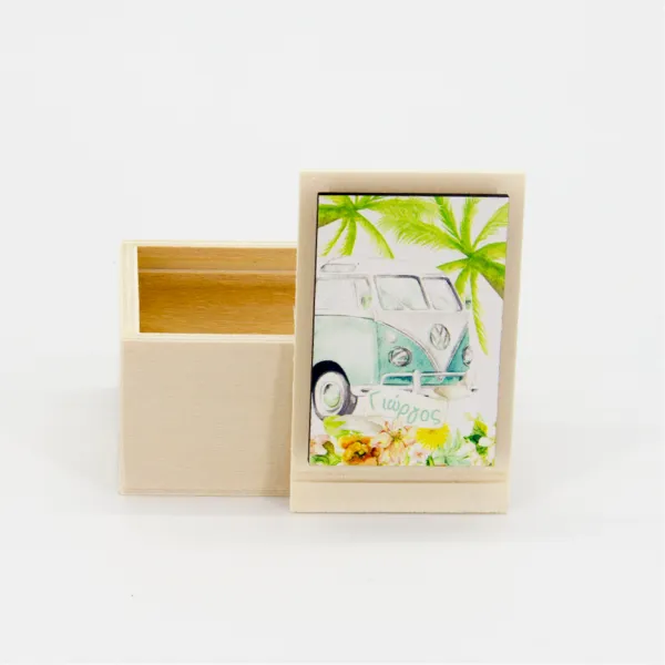 Ξύλινο συρταρωτό κουτί από σηµύδα, διάστασης 10×6,5×3,5 εκ µε προσωποποιηµένo ξύλινο tag (5×7,5 εκ)στο καπάκι.