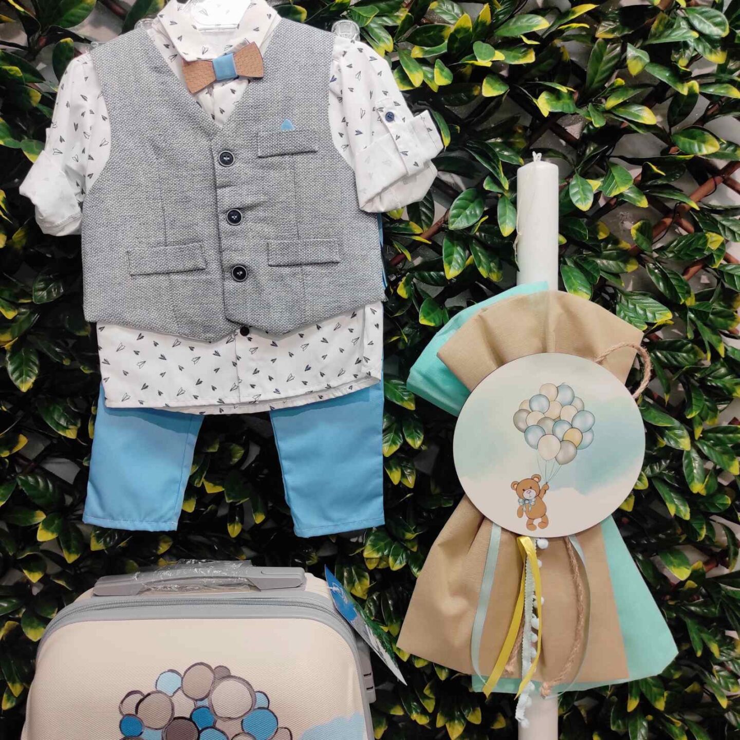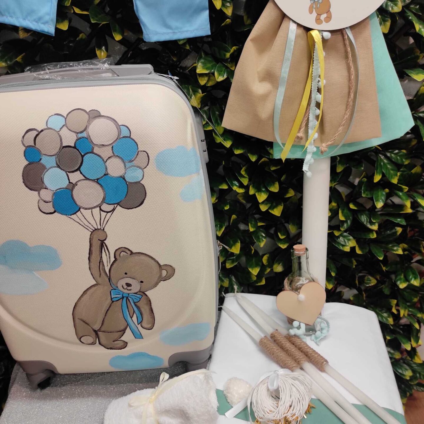 Ολοκληρωμένο πακέτο βάπτισης με θέμα αρκουδάκι, ζωγραφισμένο στο χέρι. Το πακέτο περιλαμβάνει τροχήλατη βαλίτσα, λαδόπανα, 3 κεράκια κολυμπήθρας, σαπουνάκι, μπουκαλάκι λαδιού, 50 μαρτυρικά και καλτσούλες.