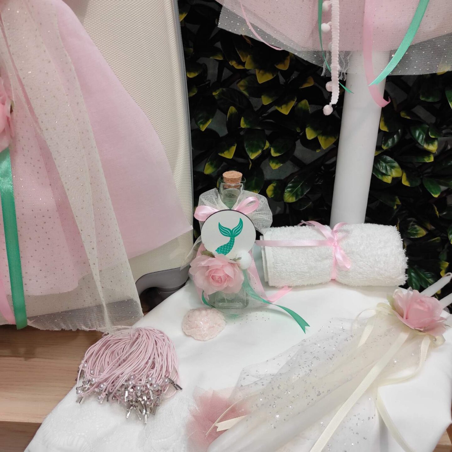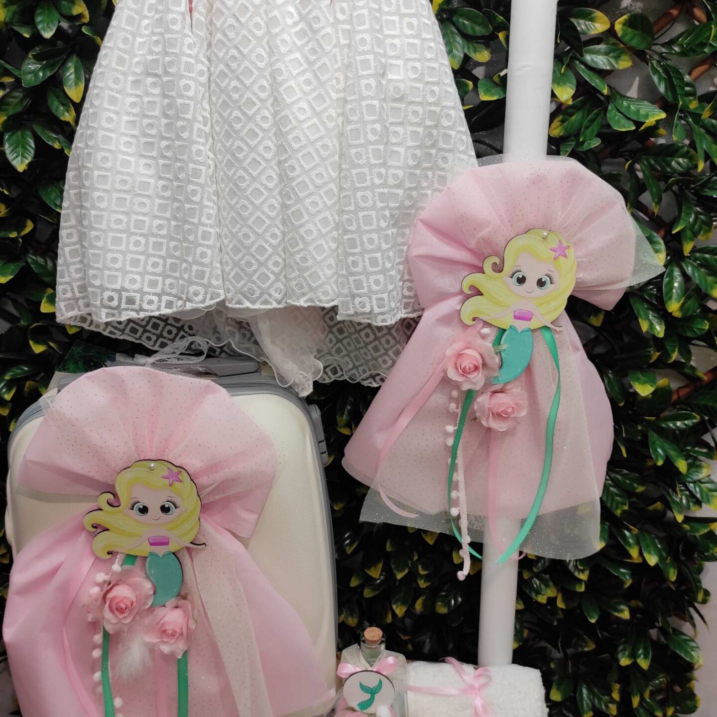Ολοκληρωμένο πακέτο βάπτισης με θέμα γοργόνα. Το πακέτο περιλαμβάνει τροχήλατη βαλίτσα, λαδόπανα, 3 κεράκια κολυμπήθρας, σαπουνάκι, μπουκαλάκι λαδιού, 50 μαρτυρικά και καλτσούλες.