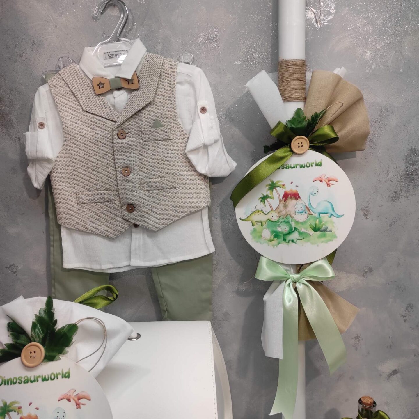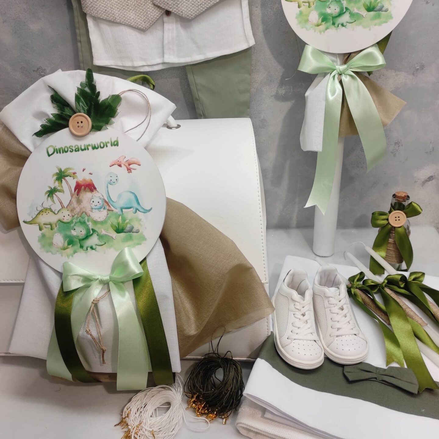 Ολοκληρωμένο πακέτο βάπτισης δεινόσαυροι. Το πακέτο περιλαμβάνει δερμάτινη τσάντα, λαδόπανα, 3 κεράκια κολυμπήθρας, σαπουνάκι, μπουκαλάκι λαδιού, πετσέτα παππά, 50 μαρτυρικά και καλτσούλες.
