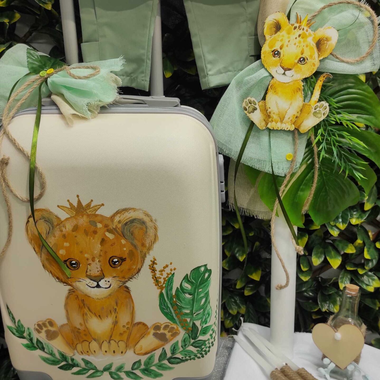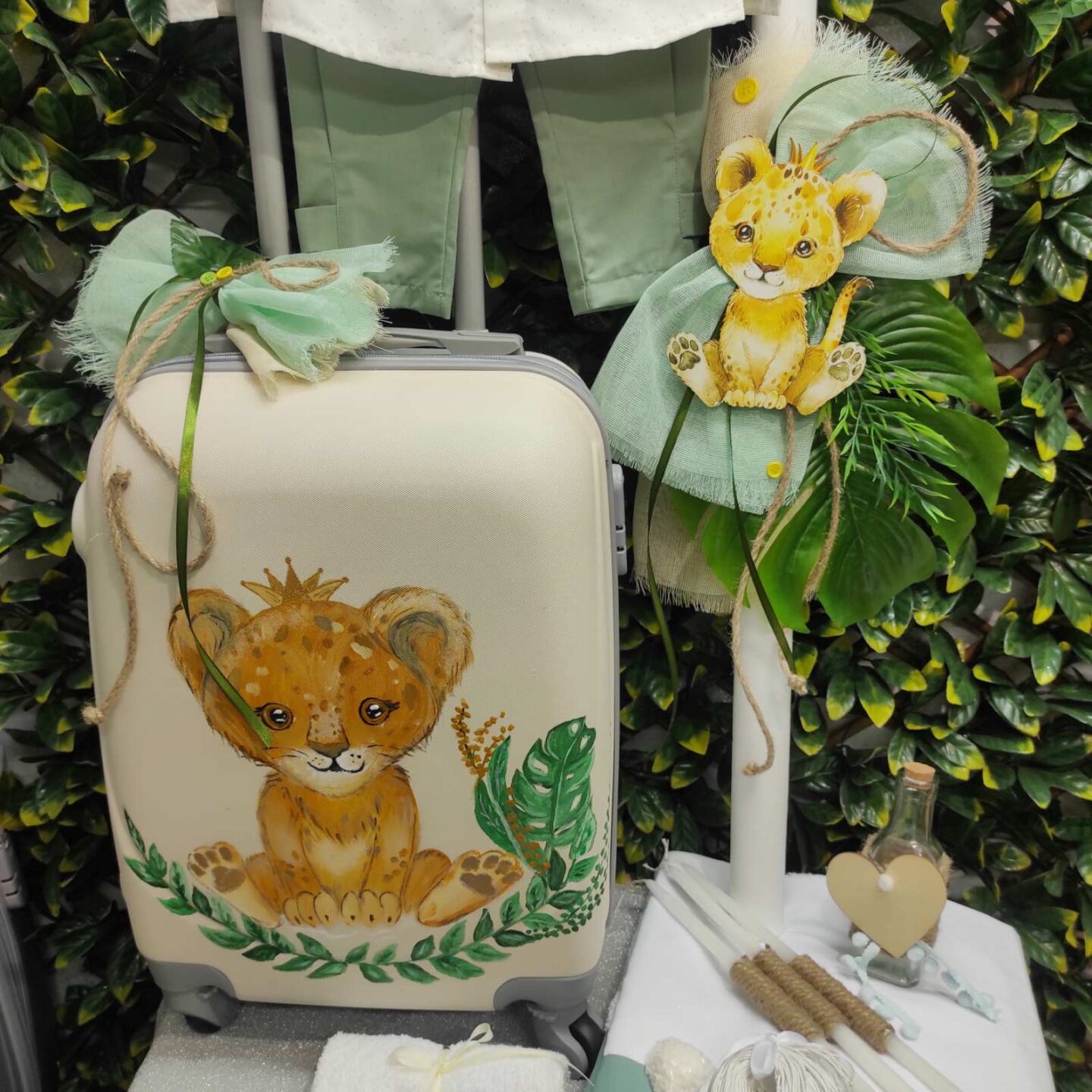 Ολοκληρωμένο πακέτο βάπτισης με θέμα λιονταράκι, ζωγραφισμένο στο χέρι. Το πακέτο περιλαμβάνει τροχήλατη βαλίτσα, λαδόπανα, 3 κεράκια κολυμπήθρας, σαπουνάκι, μπουκαλάκι λαδιού, 50 μαρτυρικά και καλτσούλες.
