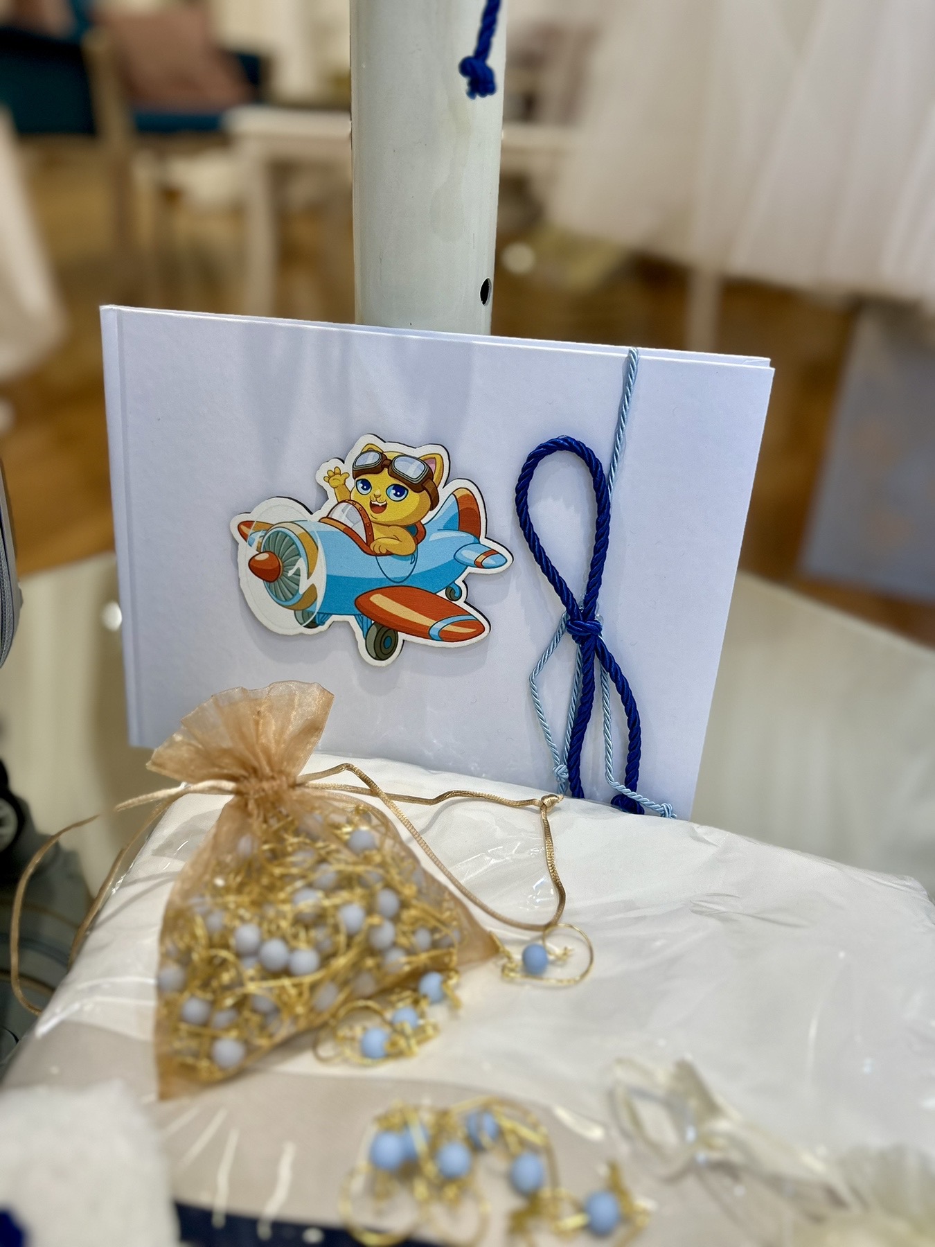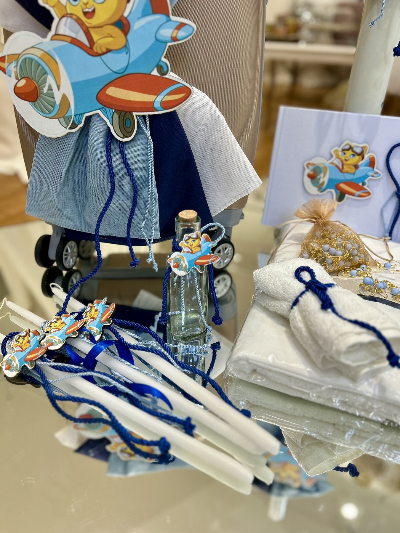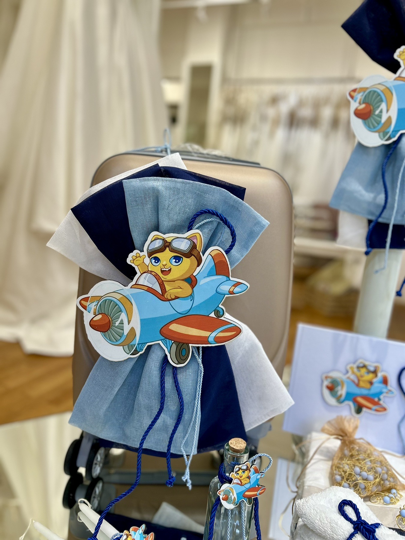 Ολοκληρωμένο πακέτο βάπτισης με θέμα Γατούλα στο Αεροπλάνο. Το πακέτο περιλαμβάνει τροχήλατη βαλίτσα, λαδόπανα, 3 κεράκια κολυμπήθρας, σαπουνάκι, μπουκαλάκι λαδιού , 50 μαρτυρικά και το βιβλίο ευχών. Επίσης περιέχει το ρούχο και παπούτσι της επιλογησ σας .