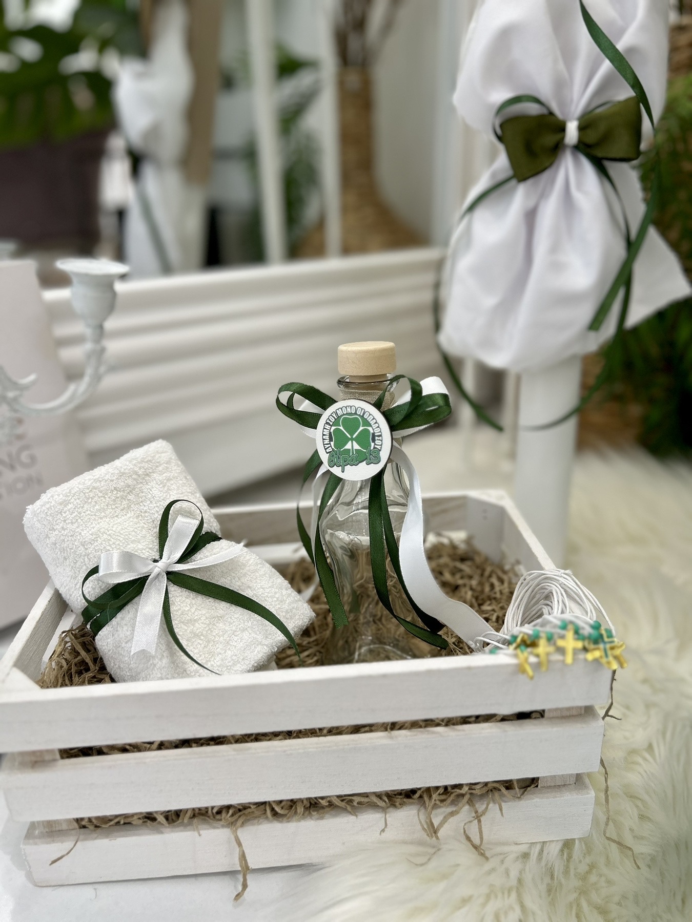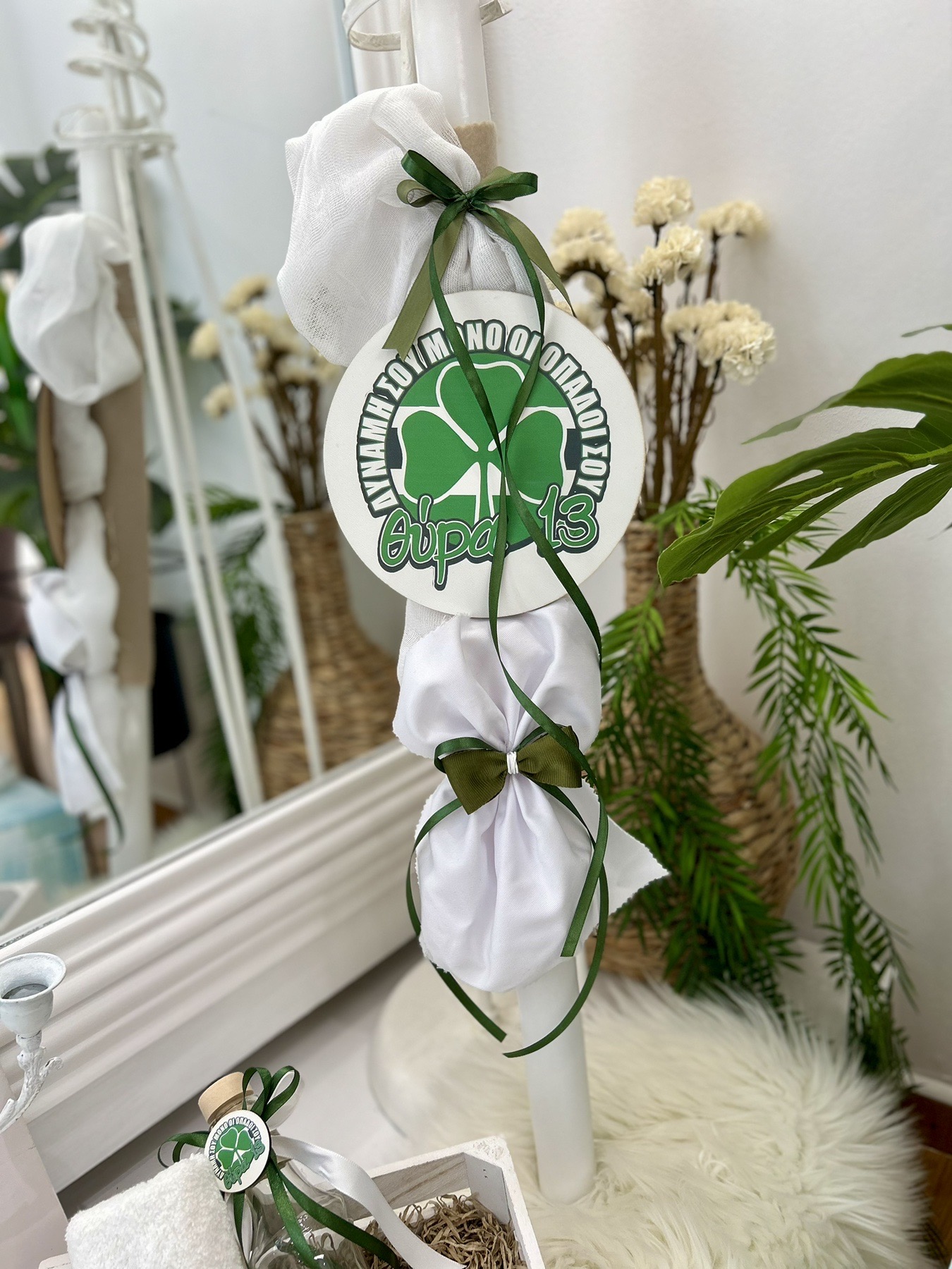 Ολοκληρωμένο πακέτο βάπτισης με θέμα Παναθηναϊκός. Το πακέτο περιλαμβάνει ξύλινο μπαούλο, λαδόπανα, 3 κεράκια κολυμπήθρας, σαπουνάκι, μπουκαλάκι λαδιού και 50 μαρτυρικά.