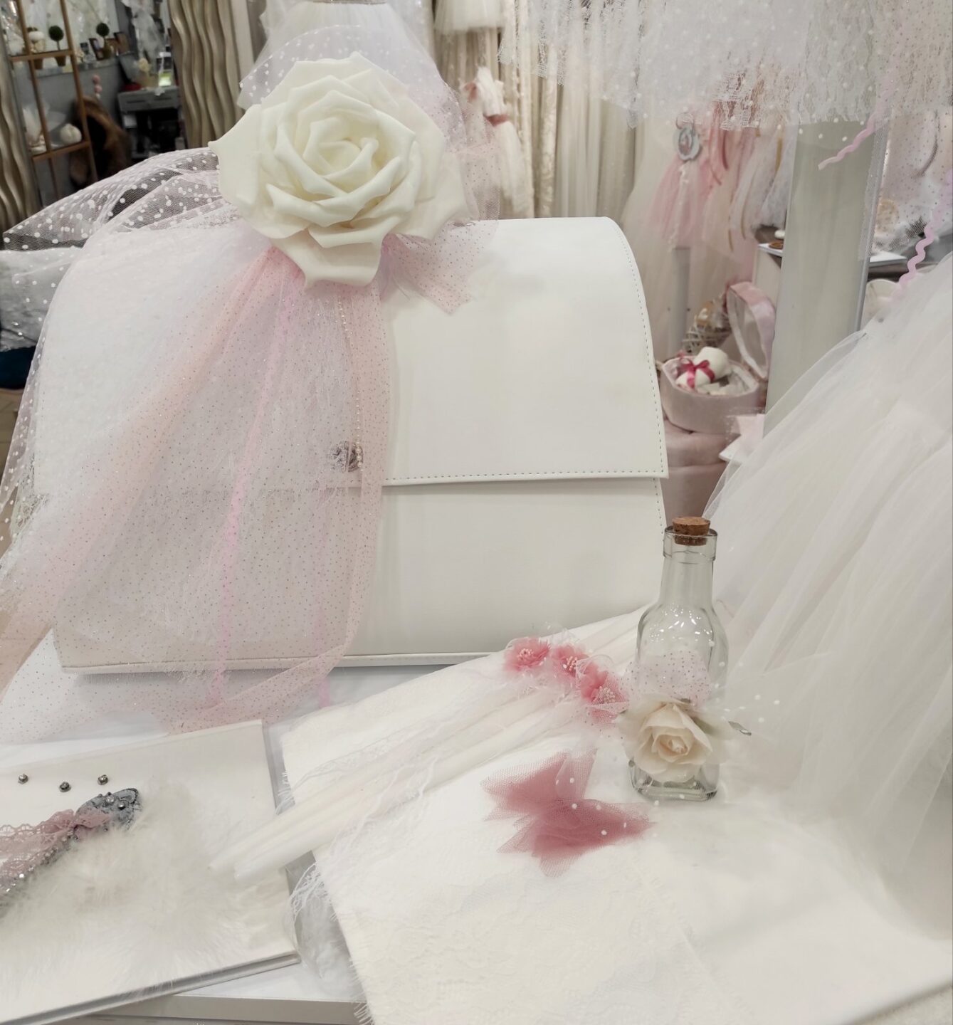Ολοκληρωμένο πακέτο βάπτισης τριαντάφυλλο. Το πακέτο περιλαμβάνει δερμάτινη τσάντα, λαδόπανα, 3 κεράκια κολυμπήθρας, σαπουνάκι, μπουκαλάκι λαδιού, πετσέτα παππά, 50 μαρτυρικά και βιβλίο ευχών.
