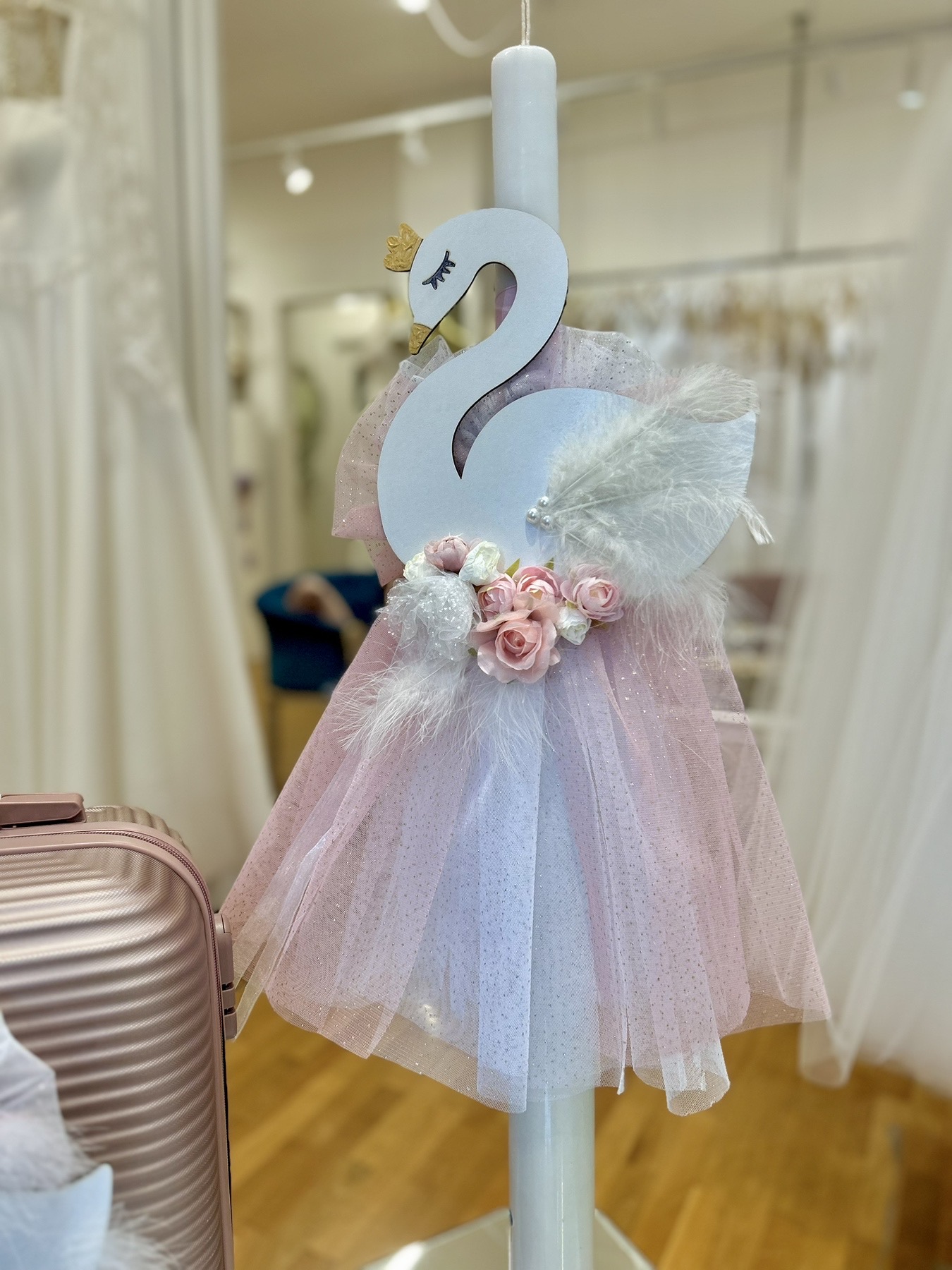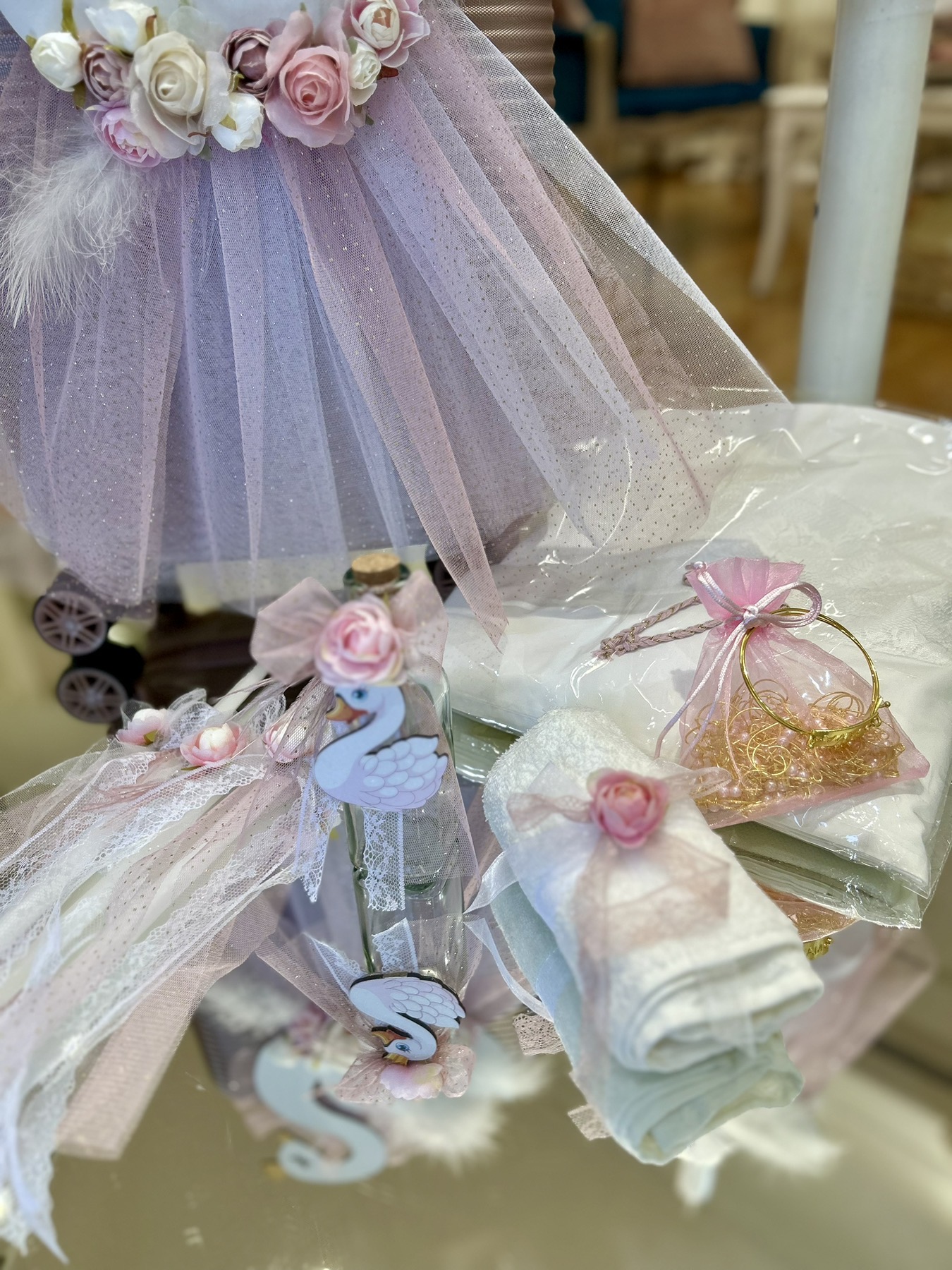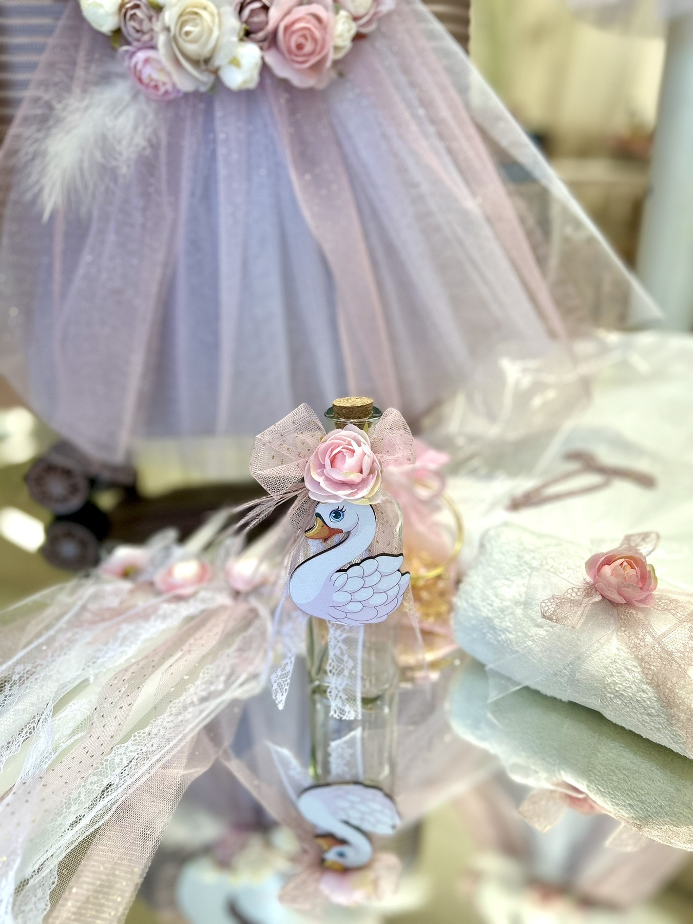 Πακέτο βάπτισης με θέμα Κύκνος. Το πακέτο περιλαμβάνει τροχήλατη βαλίτσα, λαδόπανα, 3 κεράκια κολυμπήθρας, σαπουνάκι, μπουκαλάκι λαδιού και 50 μαρτυρικά .