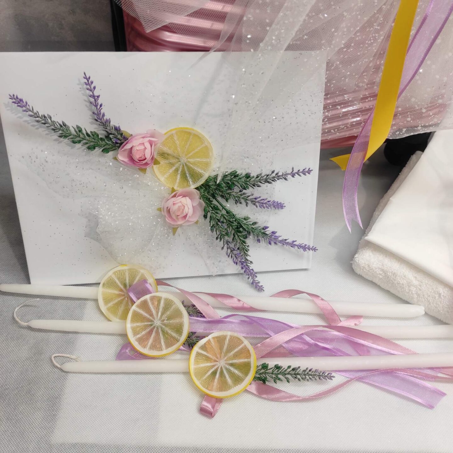 Πλήρες σετ βάπτισης λεβάντα & λεμόνι. Το σετ περιλαμβάνει βαλίτσα τροχήλατη, λαδόπανα, 3 κεράκια κολυμπήθρας, σαπουνάκι, μπουκαλάκι λαδιού, 50 μαρτυρικά και το βιβλίο ευχών.