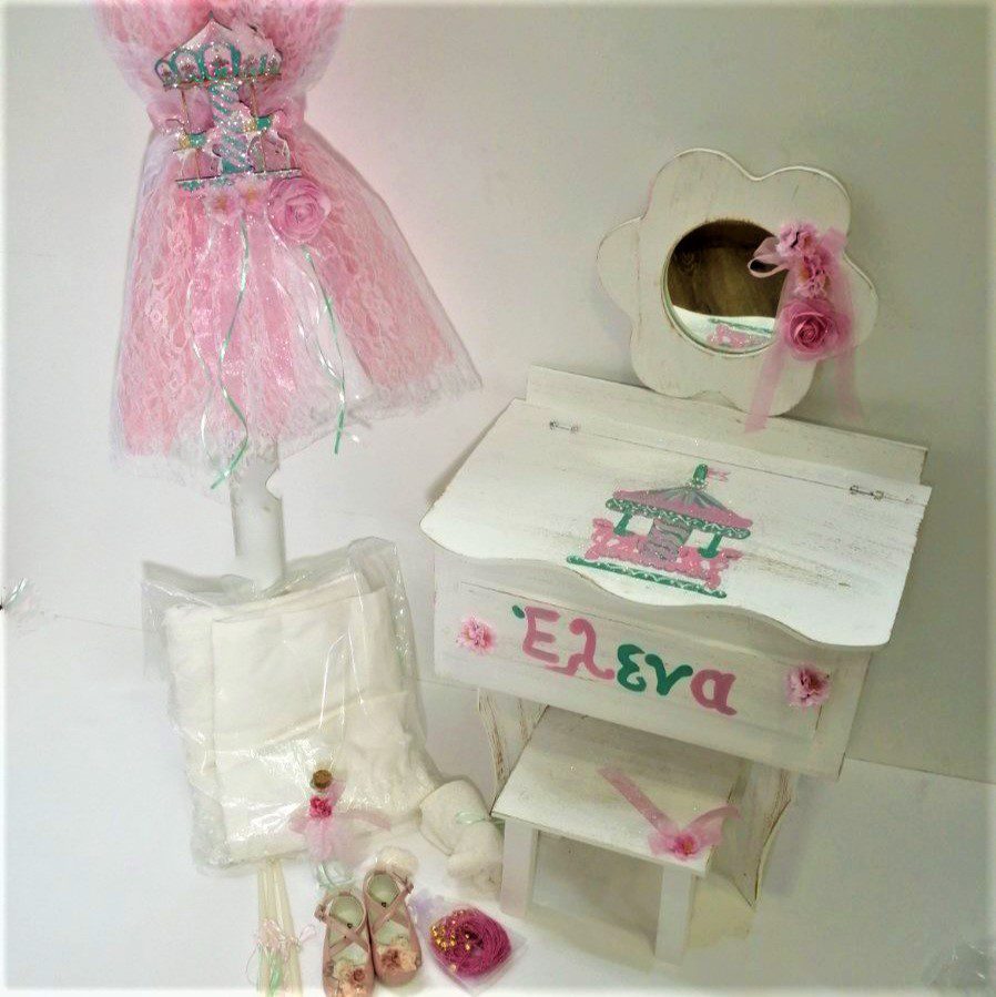 Πλήρες σετ βάπτισης με θέμα το καρουζέλ στις αποχρώσεις λευκό με ροζ, συνδυασμένο με φόρεμα και παπουτσάκι της επιλογής σας, δες εδώ τη συλλογή ρούχων και εδώ τα παπουτσάκια. Το σετ περιλαμβάνει διακόσμηση λαμπάδας (χωρίς το κερί), παγκάκι διακοσμημένο με χειροποίητη ζωγραφιά κύκνο, λουλουδάκια και δαντέλες, λαδόπανα, πετσέτες, εσώρουχα, 50 μαρτυρικά, 3 κεράκια, σαπουνάκια, φόρεμα και παπουτσάκι της αρεσκείας σας. Όλο το σετ είναι χειροποίητο και ζωγραφισμένο στο χέρι, χρειάζεται 10-12 μέρες παράδοσης. Με το πλήρες σετ με φόρεμα και παπούτσι επωφελείστε με 15% έκπτωση στο σύνολο!