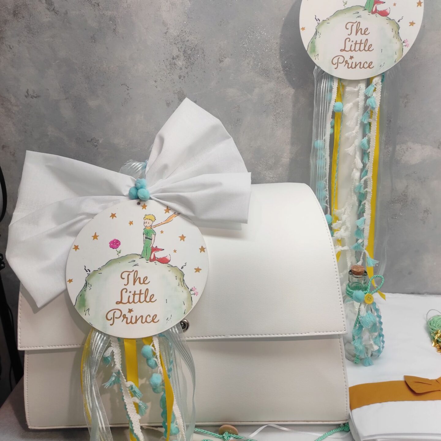 Πλήρες σετ βάπτισης μικρός πρίγκιπας. Το σετ περιλαμβάνει δερμάτινη τσάντα, λαδόπανα, 3 κεράκια κολυμπήθρας, σαπουνάκι, μπουκαλάκι λαδιού και 50 μαρτυρικά