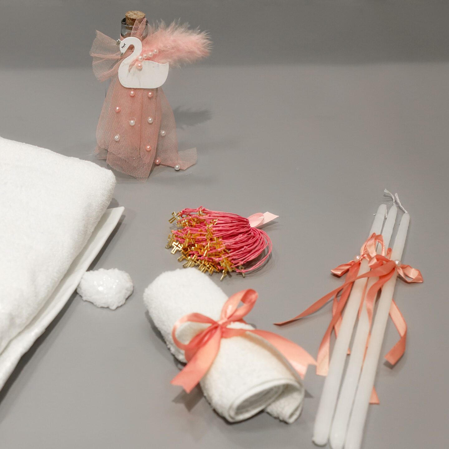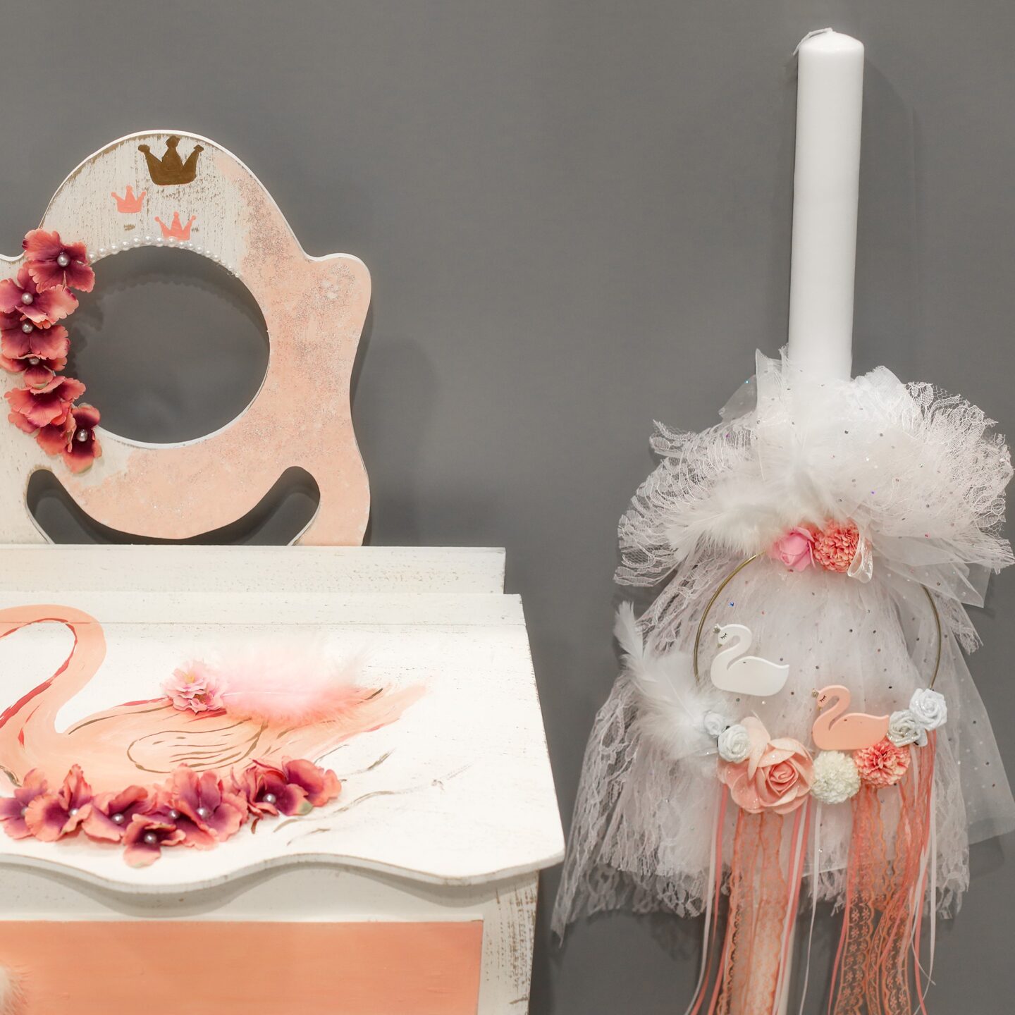 Πλήρες σετ βάπτισης μπουντουάρ με Κύκνο, σε λευκό, ροζ, σομόν και σάπιο μήλο. Συνοδεύεται από ξύλινο μπουντουάρ με καθρέφτη και σκαμπό. Το σετ περιλαμβάνει στολισμένο μπουντουάρ , στολισμό λαμπάδας (δεν συμπεριλαμβάνεται το κερί), 50 μαρτυρικά, 3 κεράκια στολισμένα, μπουκαλάκι λαδιού, σαπουνάκια, πετσέτες, σετ λαδόπανα και εσώρουχα. Το σετ κουτί βάφτισης είναι χειροποίητο και χρειάζεται 10-12 μέρες παράδοσης.