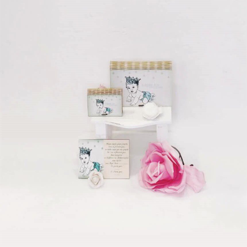 Πλήρες σετ βάπτισης με θέμα Grow up litle one, μωρό με στέμμα, με τροχήλατη βαλίτσα. Το σετ περιλαμβάνει βαλίτσα ταξιδιού στολισμένη, στολισμό λαμπάδας (δεν συμπεριλαμβάνεται το κερί), 50 μαρτυρικά, 3 κεράκια στολισμένα, μπουκαλάκι λαδιού, σαπουνάκια, πετσέτες, σετ λαδόπανα και εσώρουχα. Τα ξύλινα διακοσμητικά στοιχεία είναι με ψηφιακή έγχρωμη εκτύπωση στο ίδιο θέμα. Το σετ κουτί βάφτισης είναι χειροποίητο και χρειάζεται 10-12 μέρες παράδοσης.