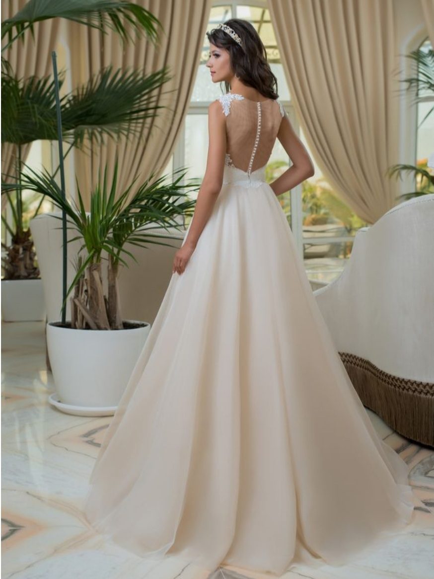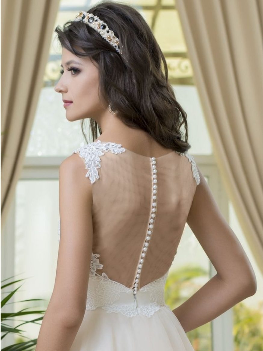 Πριγκηπικό Nυφικό με ιβουάρ φούστα, μπούστο κεντημένο με γαλλική δαντέλα και ανοιχτή πλάτη με διαφάνεια soleil κεντημένη με δαντέλα. Κανονική εφαρμογή