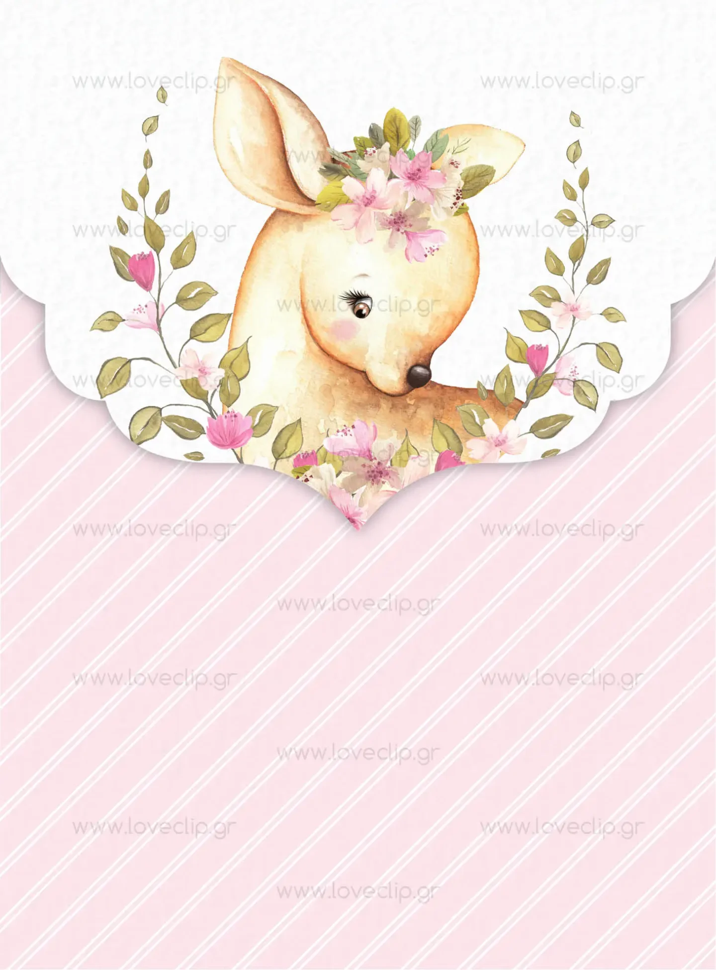 Προσκλητήριο με θέμα το ελαφάκι, με στεφάνι στο κεφάλι και φλοράλ διακόσμηση.