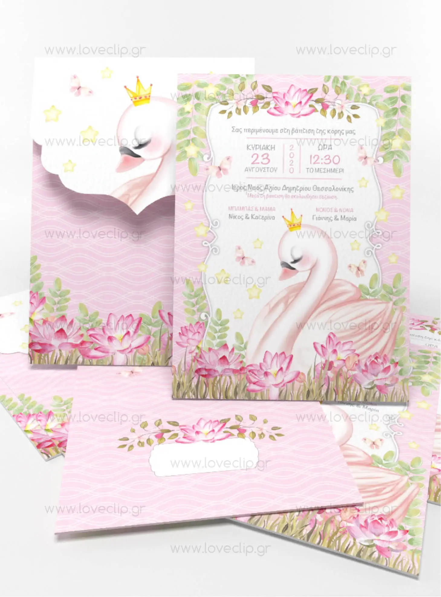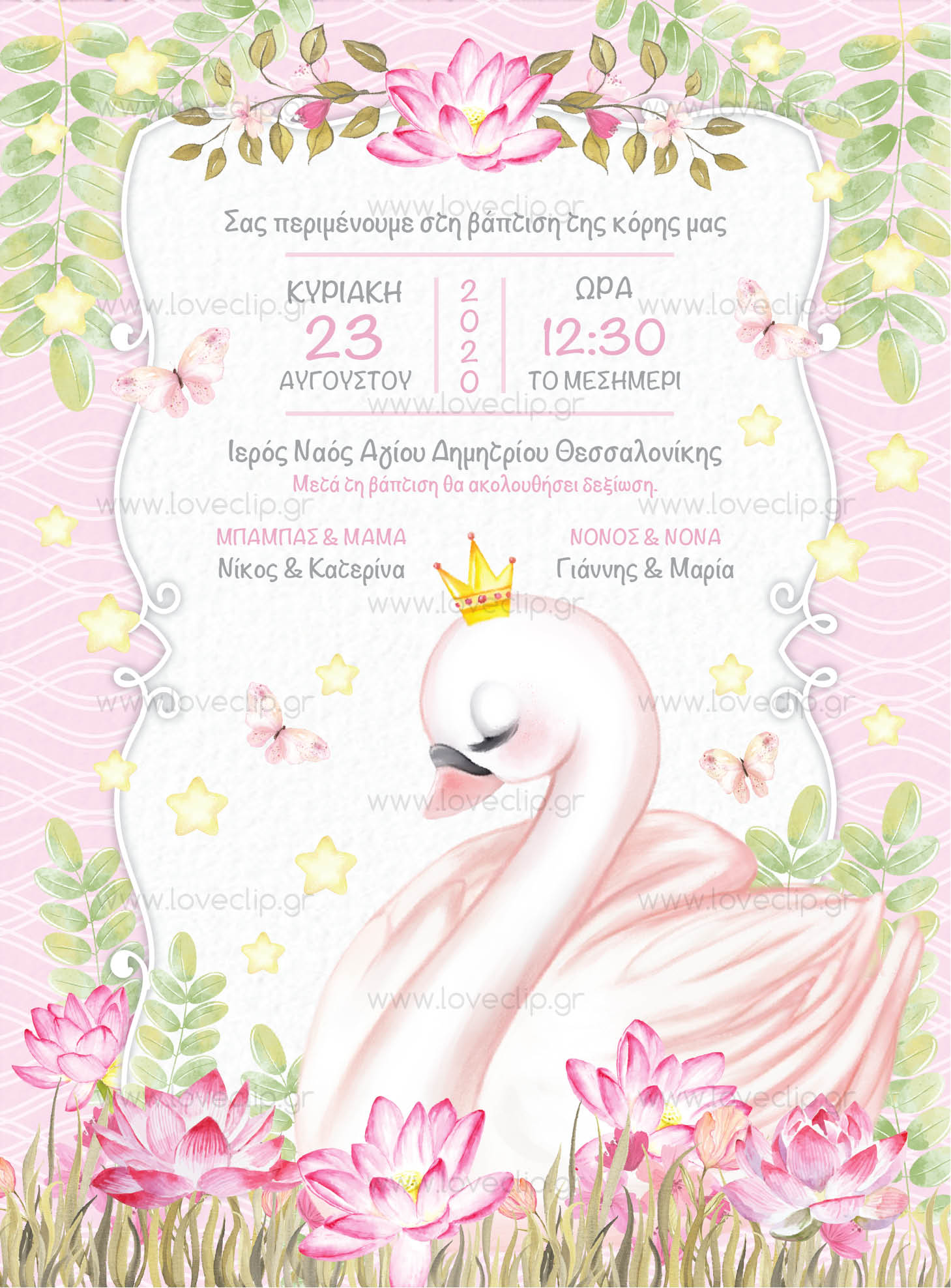 Προσκλητήριο με θέμα τον κύκνο, νούφαρα, κορώνα και φλοράλ διακόσμηση..