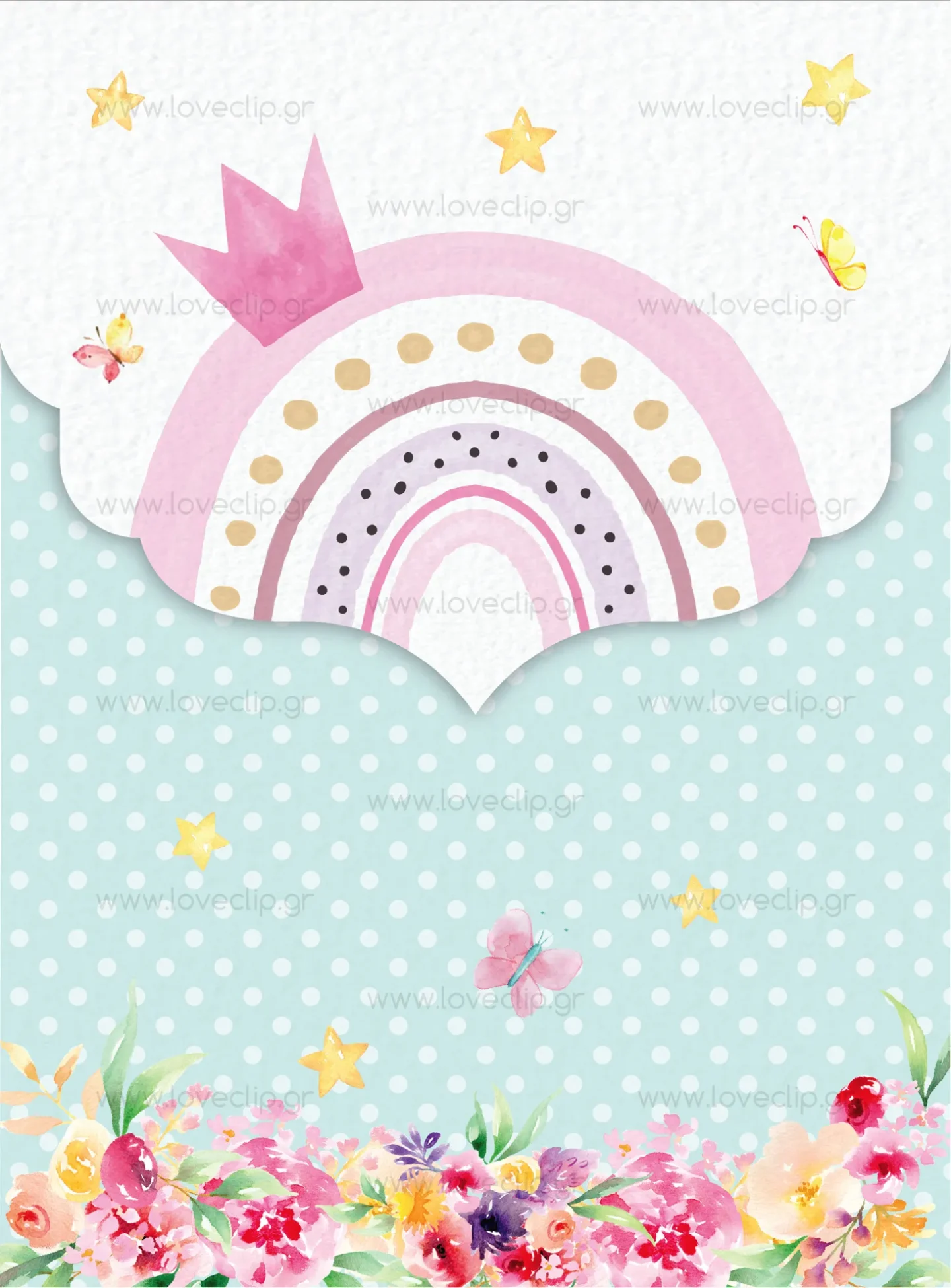 Προσκλητήριο με θέμα boho ουράνιο τόξο, με κορώνα και φλοράλ διακόσμηση.