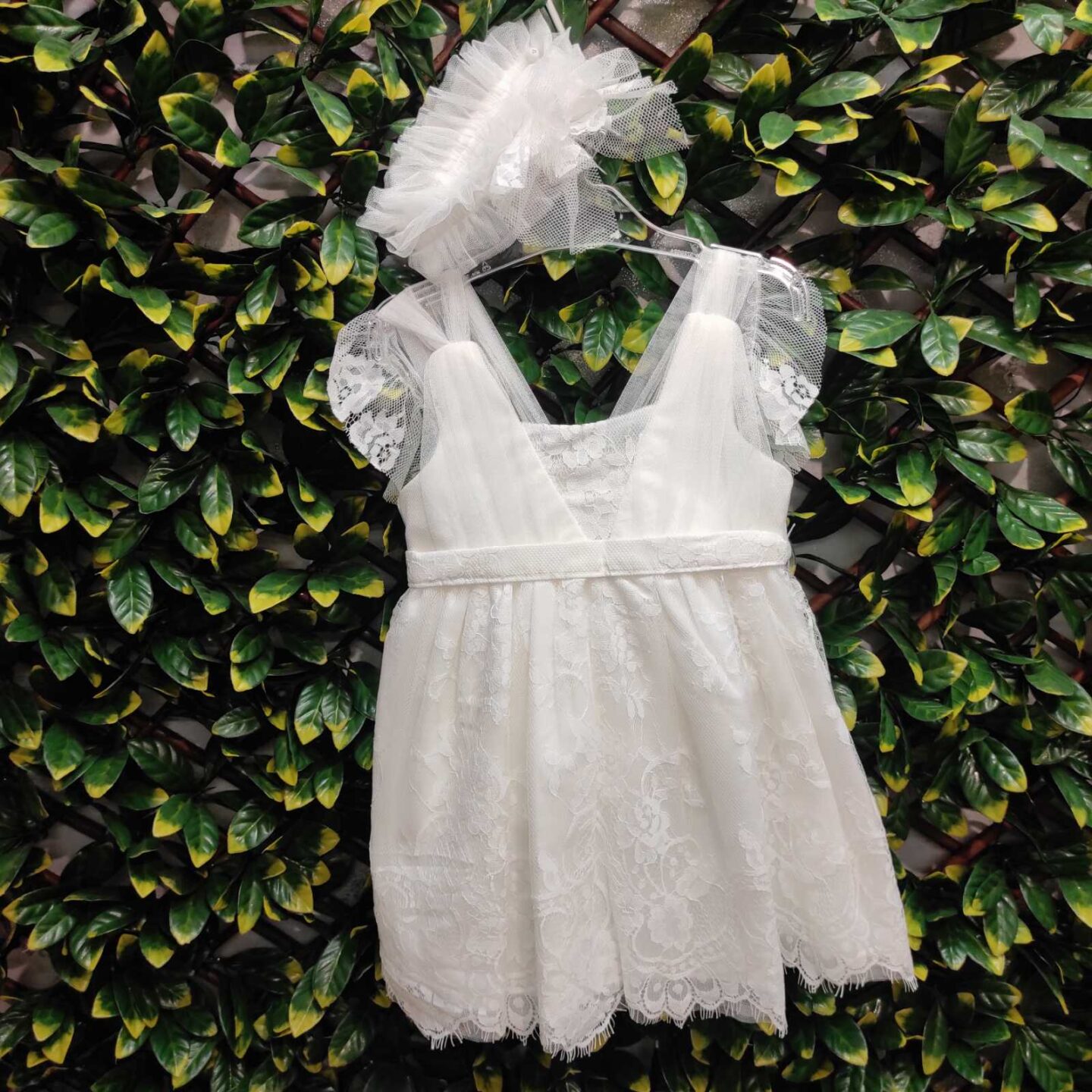 Ρομαντικό βαπτιστικό φόρεμα με άσπρη δαντέλα . Καλύπτει εως 24 μηνών.