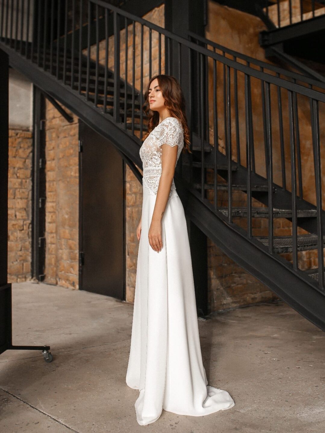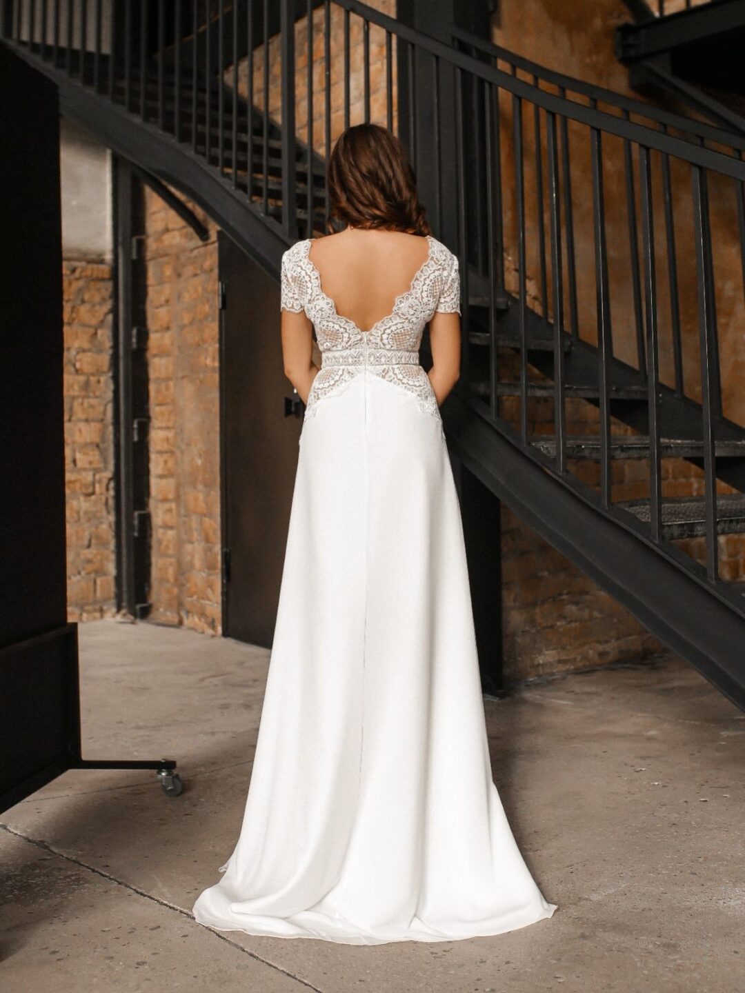 Ρομαντικό νυφικό με δαντέλα. Διαθέτει δαντέλα στο επάνω μέρος. Βαθύ μπούστο V και ανοιχτή πλάτη.