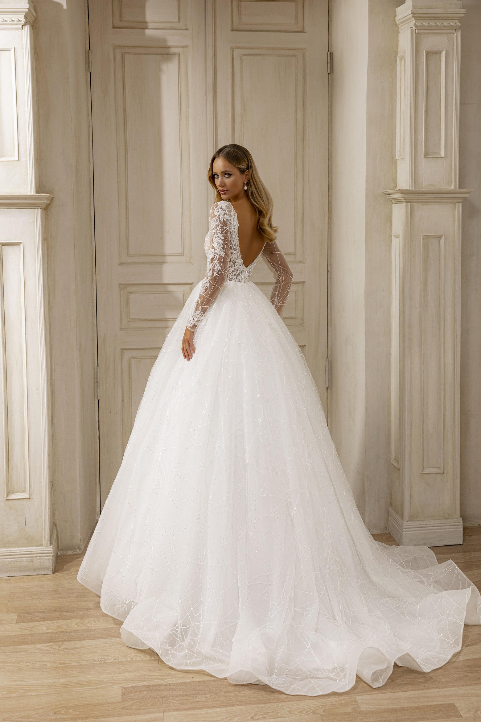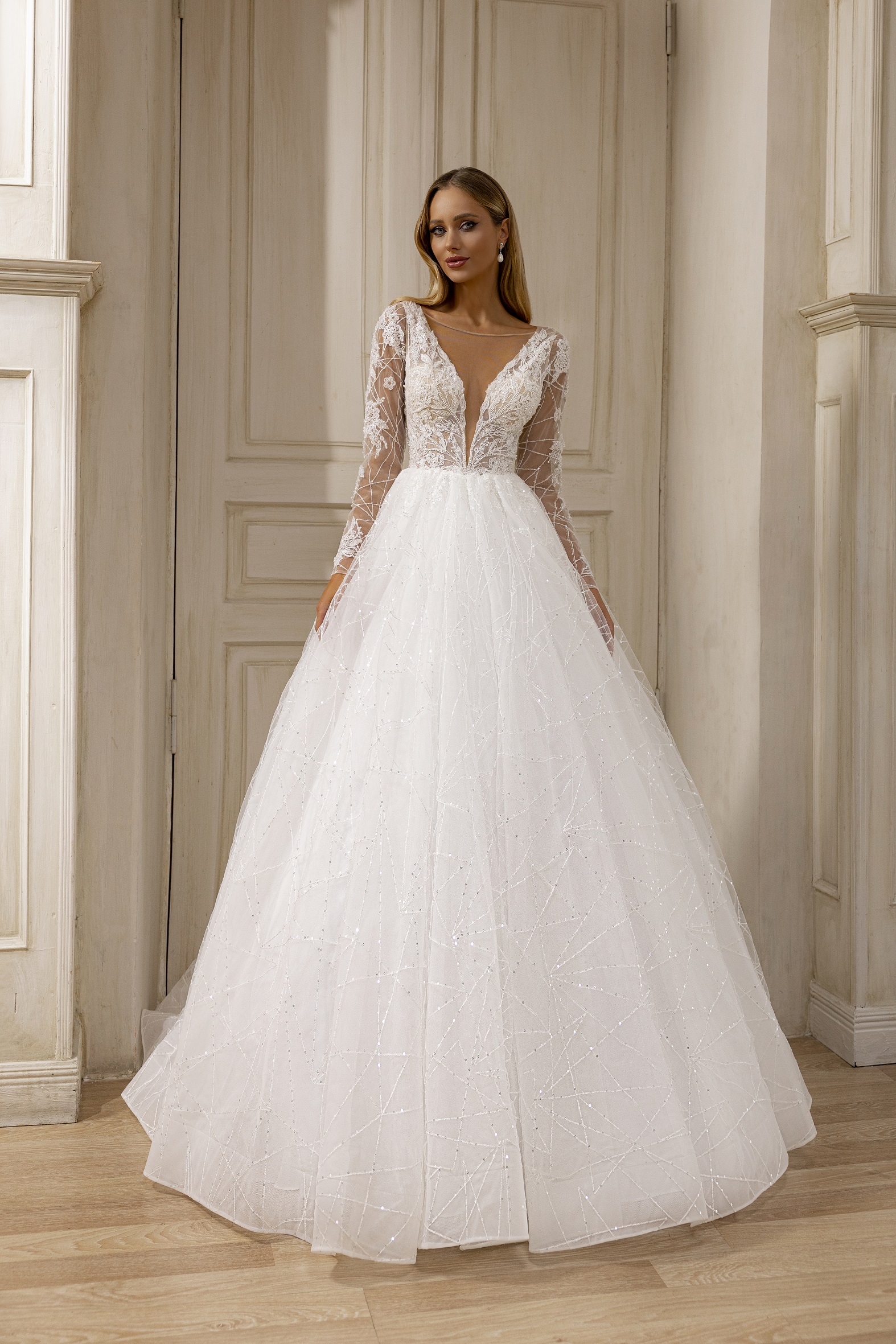 Ρομαντικό νυφικό με διακριτικό στράς. Διαθέτει βαθύ μπούστο V με διαφάνεια και μακρύ μανίκι με διαφάνεια και κεντητές λεπτομέριες. Έχει ολόκληρο το νυφικό διακριτικό στράς