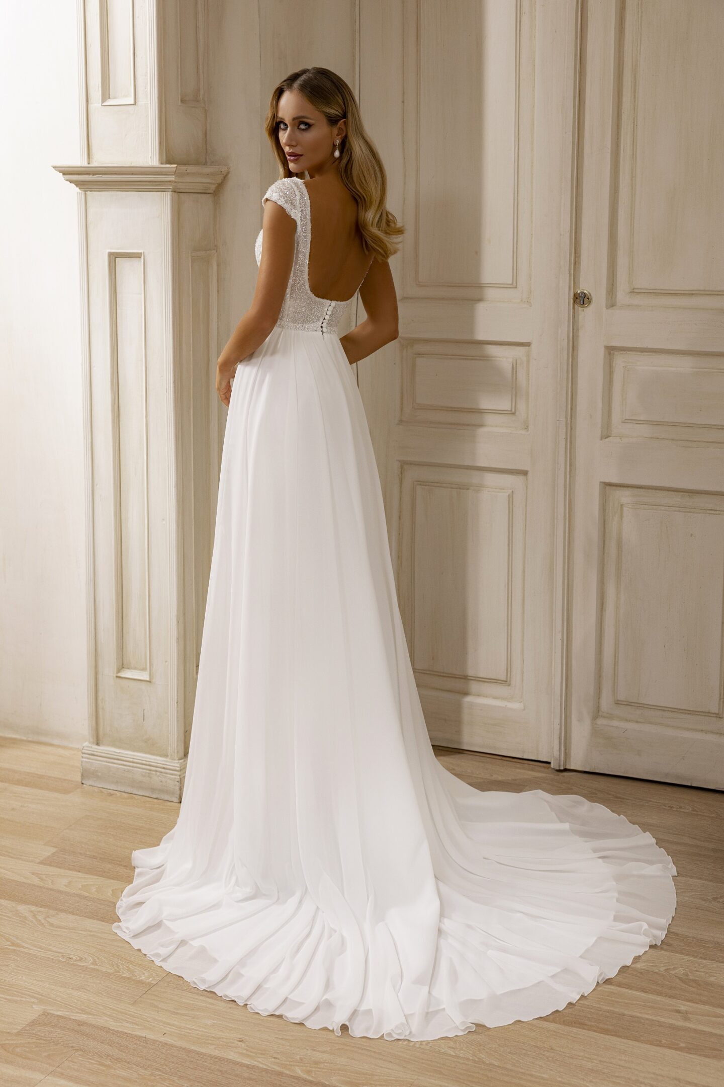 Ρομαντικό νυφικό με σκίσιμο και ουρά. Διαθέτει μπούστο V και ανοιχτή πλάτη. Έχει σκίσιμο στην φούστα και μεγάλη ουρά