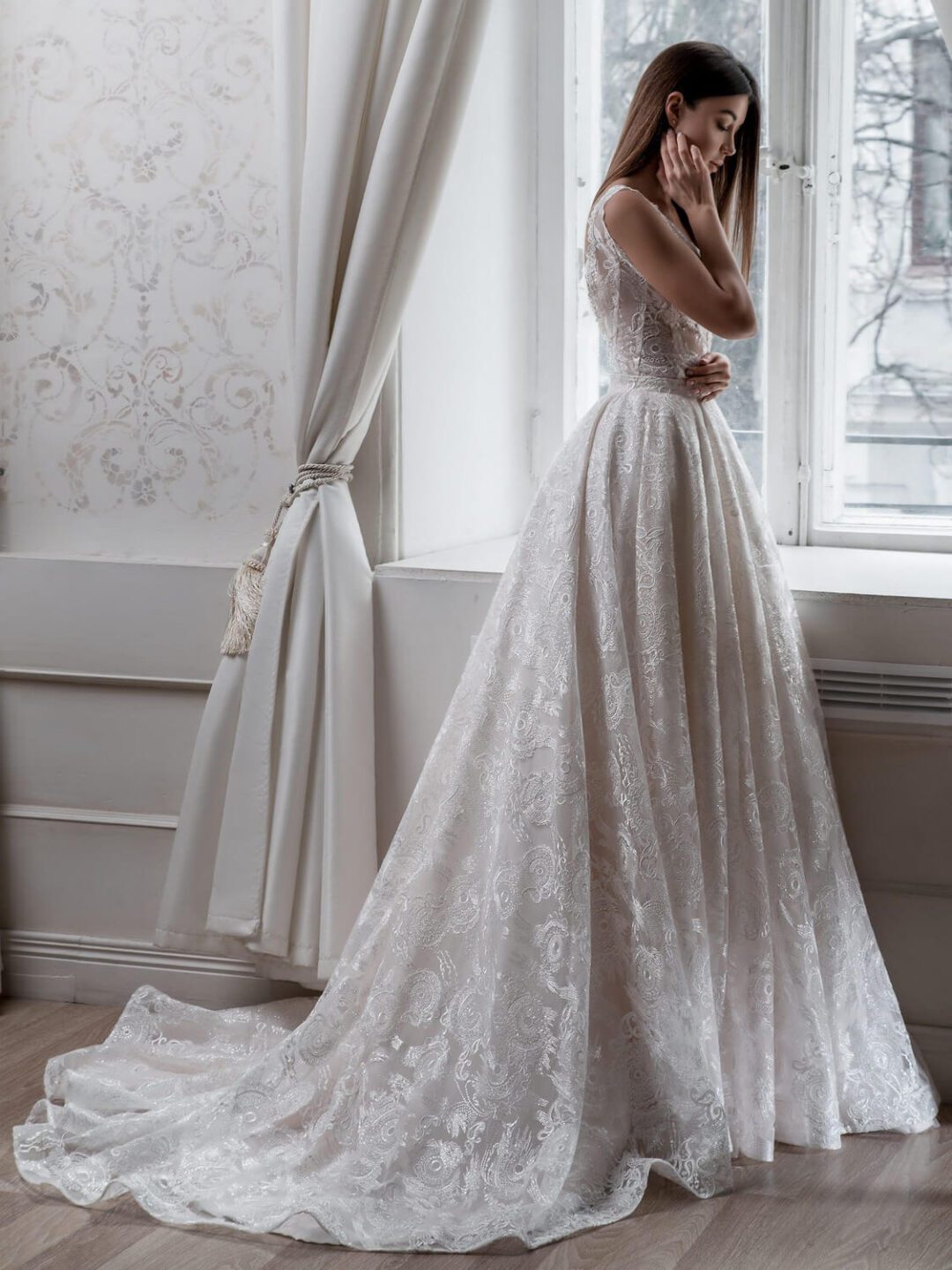 Ρομαντικό νυφικό σε άλφα γραμμή από γαλλικό τούλι απλικαρισμένο όλο με κεντημένη δαντέλα, μπούστο με V κεντημένο και άνοιγμα V στο πίσω μέρος της πλάτης. Πολλές νύφες μας, μας έχουν εμπιστευτεί και έχουν αγοράσει με τις συμβουλές μας το νυφικό τους online. Αν δεν είσαι σίγουρη για την εφαρμογή του μπορείς να κλείσεις ραντεβού για πρόβα στο info@missvanity.gr για να επισκεφτείς το φυσικό μας κατάστημα και κέρδισε 10% έκπτωση. Για οποιαδήποτε πληροφορία ή ραντεβού κάλεστε στο 22210 86623.