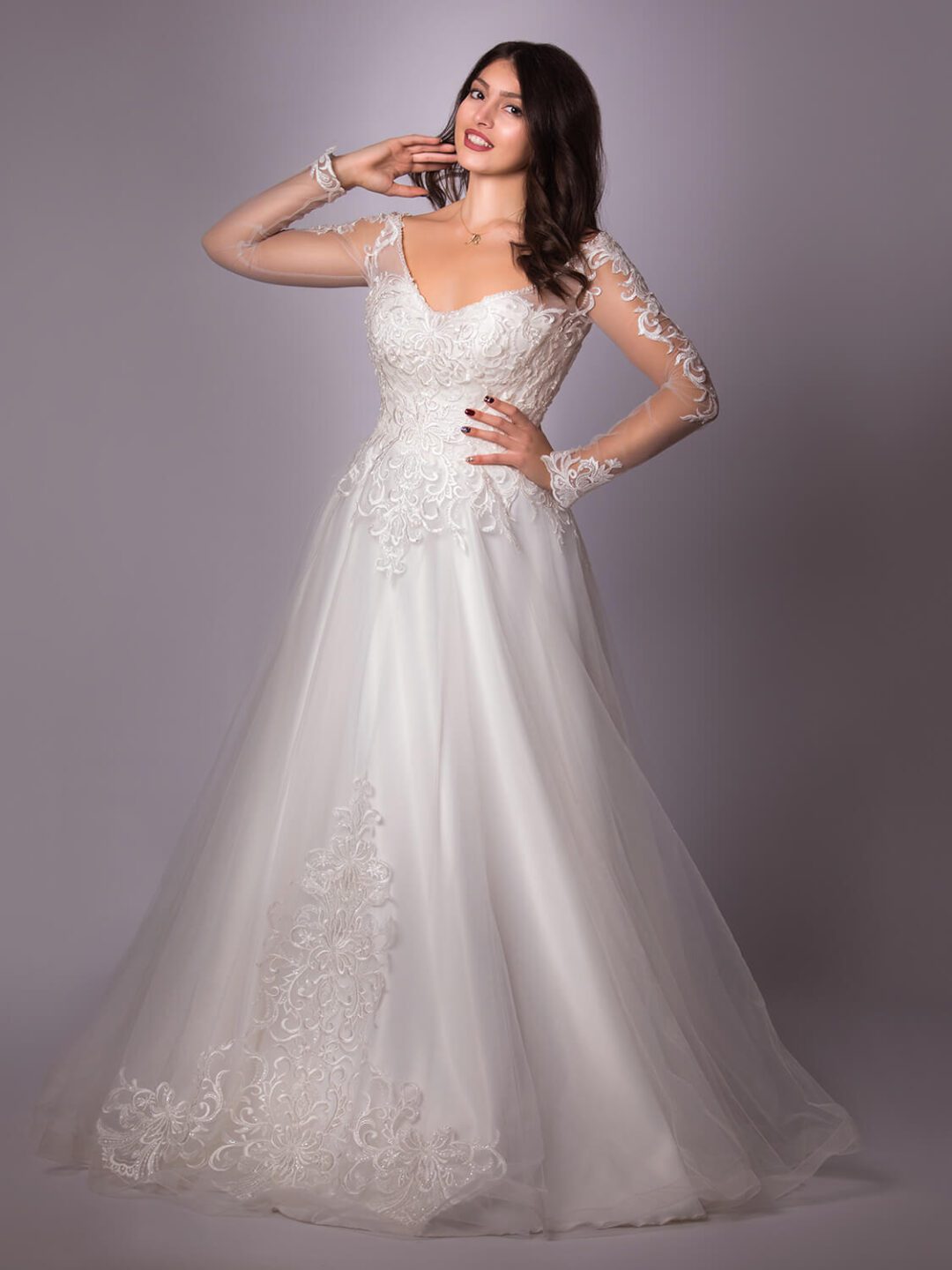 Ρομαντικό νυφικό στράπλες με γκλίτερ τούλι. Μπούστο καρδιά με cups, με διαφάνεια soleil και μανίκι ριχτό στο μπράτσο. Πλούσια ψιλόμεση φούστα σε Άλφα γραμμή με ουρά. Κανονική εφαρμογή