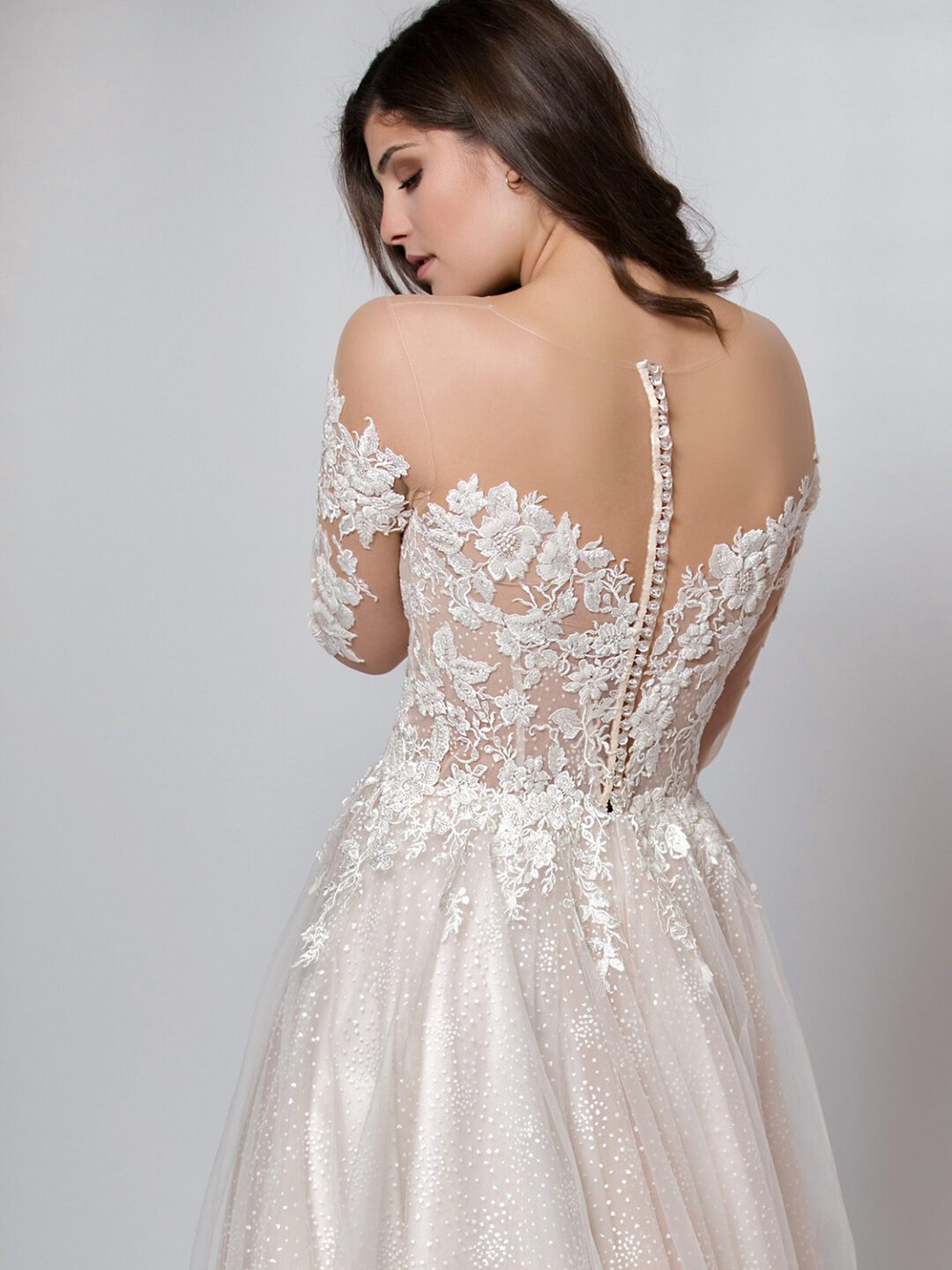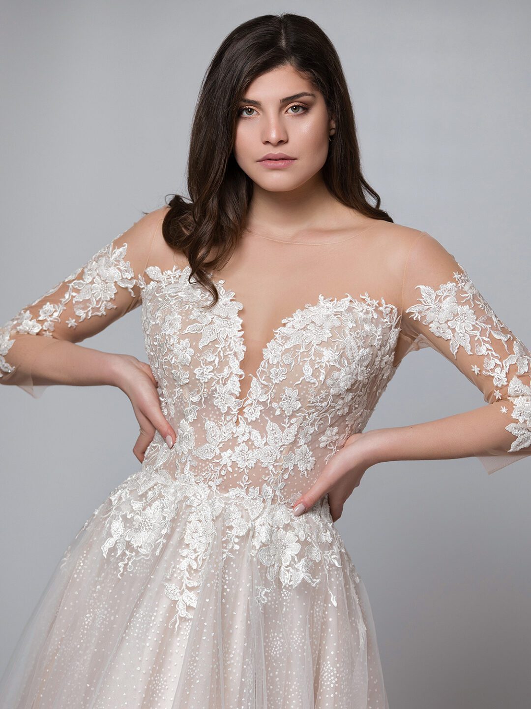 Ρομαντικό princess look νυφικό από γαλλικό τούλι στο χρώμα της πούδρας με effect glitter πουά. Εντυπωσιακή φούστα σε άλφα γραμμή, υπέροχο μπούστο ολοκέντητο με χάντρα , το τμήμα που αγκαλιάζει τους ώμους είναι φιλοτεχνημένο από λεπτομέρειες 3D γαλλικής δαντέλας. Αποτελείται από μεταξωτό solid τούλι το οποίο δίνει την αίσθηση του γυμνού αλλά στην ουσία δημιουργεί υπέροχο φινίρισμα στο δέρμα και τέλειο κράτημα στο στήθος. Κατασκευασμένο εξολοκλήρου στην Ελλάδα. Η τιμή αφορά στην αγορά ολοκαίνουργιου νυφικού.