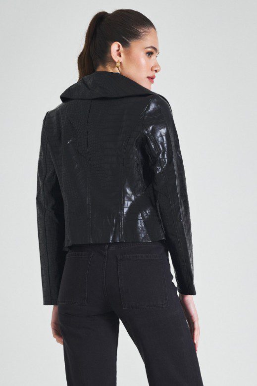 Σακάκι δερματίνη με όψη croco σε μαύρο. Slim εφαρμογή. Διαθέτει μεγάλο πέτο και κλείνει με κουμπί