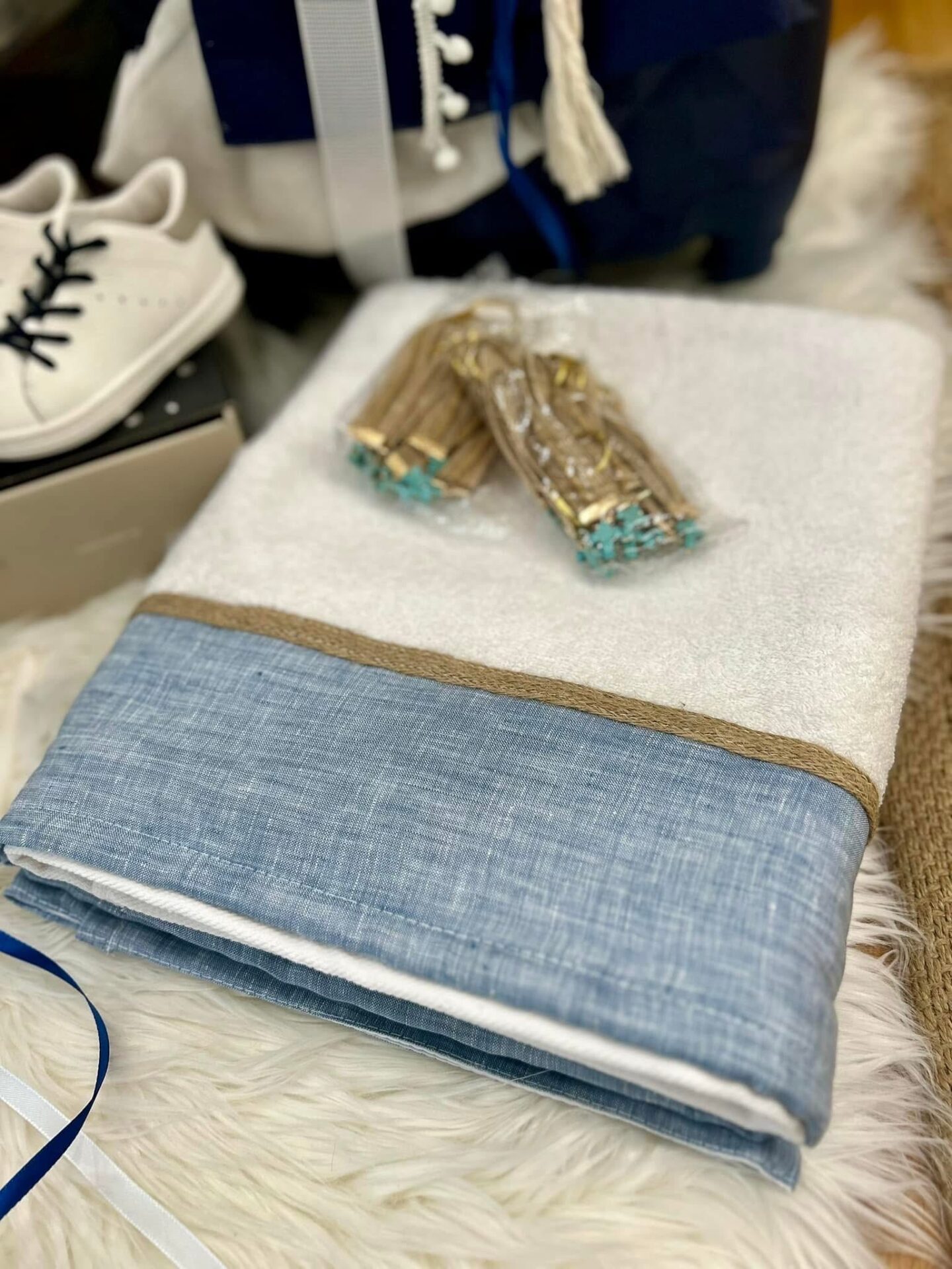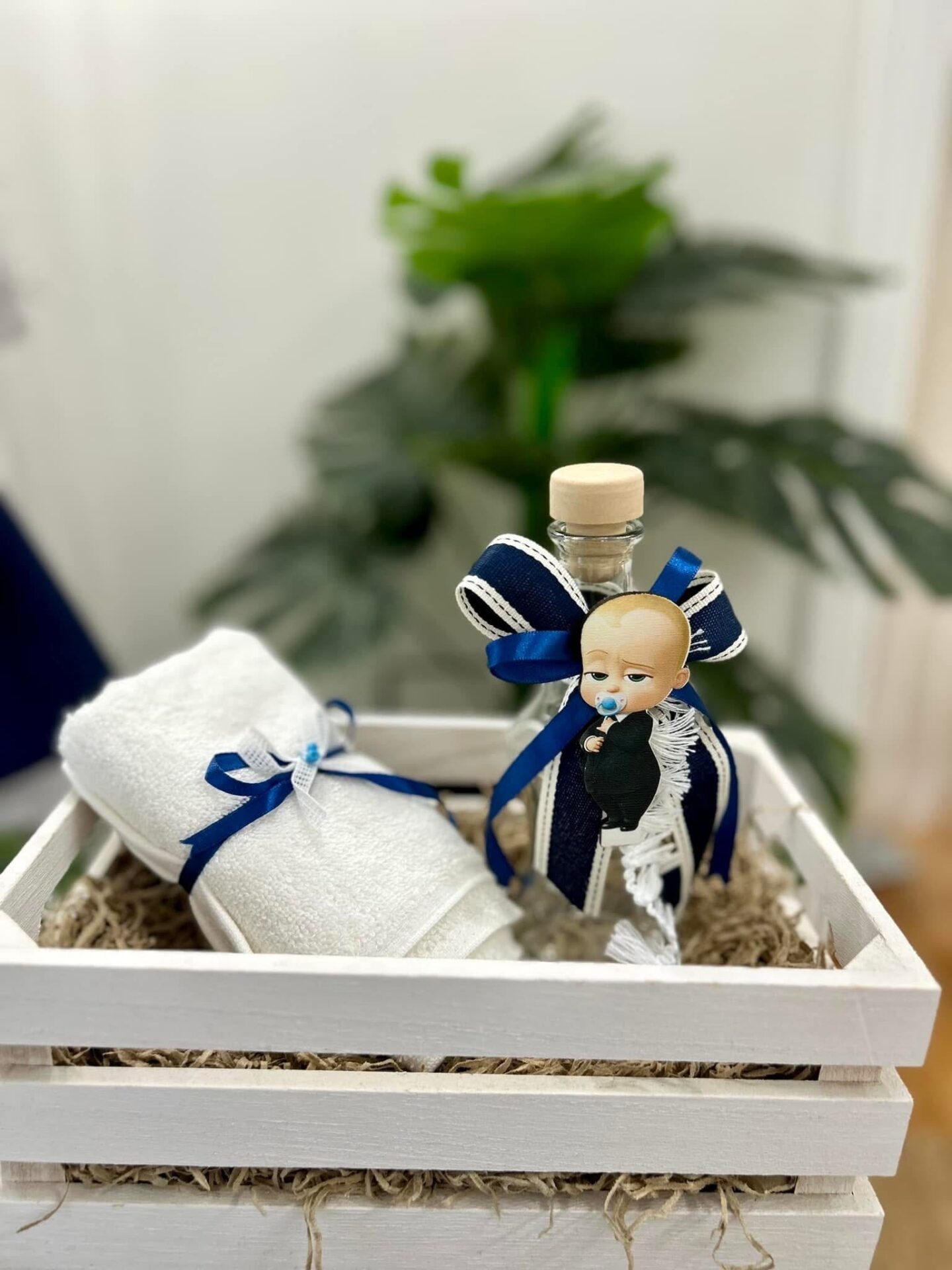 Σετ βάπτισης για αγόρια με βελούδινο μπαούλο. Το πακέτο περιλαμβάνει μεγάλο βελούδινο μπαούλο, μικρό βελούδινο κουτί, στολισμό λαμπάδας με θέμα της επιλογής σας (δεν συμπεριλαμβάνεται το κερί), λαδόπανα, 3 κεράκια κολυμπήθρας, σαπουνάκι, μπουκαλάκι λαδιού και 50 μαρτυρικά της επιλογής σας.