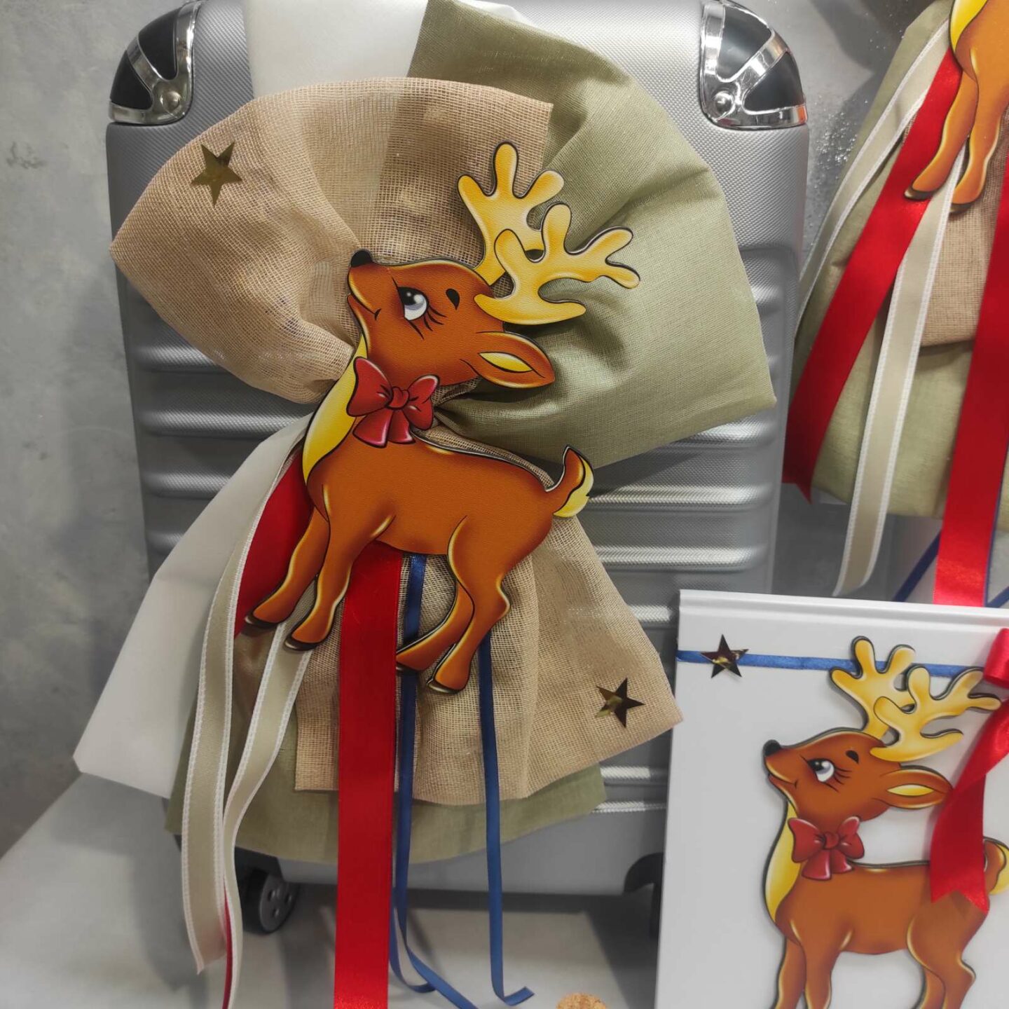 Πλήρες σετ βάπτισης ελαφάκι. Το σετ περιλαμβάνει στολισμένη τροχήλατη βαλίτσα ταξιδίου, στολισμό λαμπάδας (δεν συμπεριλαμβάνεται το κερί), βιβλιαράκι για ευχές και στολισμένο μπουκαλάκι λαδιού.