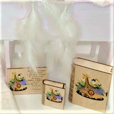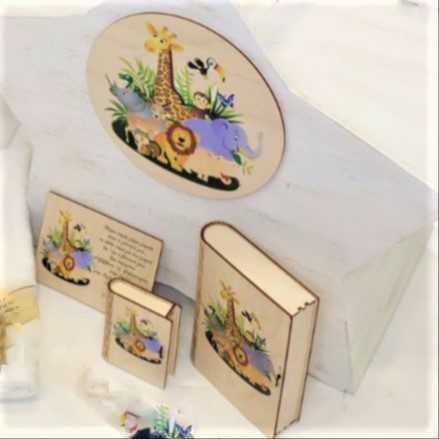 Σετ βάπτισης με ξύλινο αστέρι και θέμα τα ζώα της ζούγκλας. Το σετ περιλαμβάνει ξύλινο αστέρι με αποθηκευτικό χώρο, σε off white παλαιωμένο στολισμένο, στολισμό λαμπάδας (δεν συμπεριλαμβάνεται το κερί) διακοσμημένα με τούλι, δαντέλα και στρογγυλό ξύλινο διακοσμητικό με το θέμα σε μεταξοτυπία, 50 μαρτυρικά, 3 κεράκια, μπουκαλάκι λαδιού, σαπουνάκια, πετσέτες, σετ λαδόπανα και εσώρουχα. Το σετ κουτί βάφτισης είναι χειροποίητο και χρειάζεται 10-12 μέρες παράδοσης.