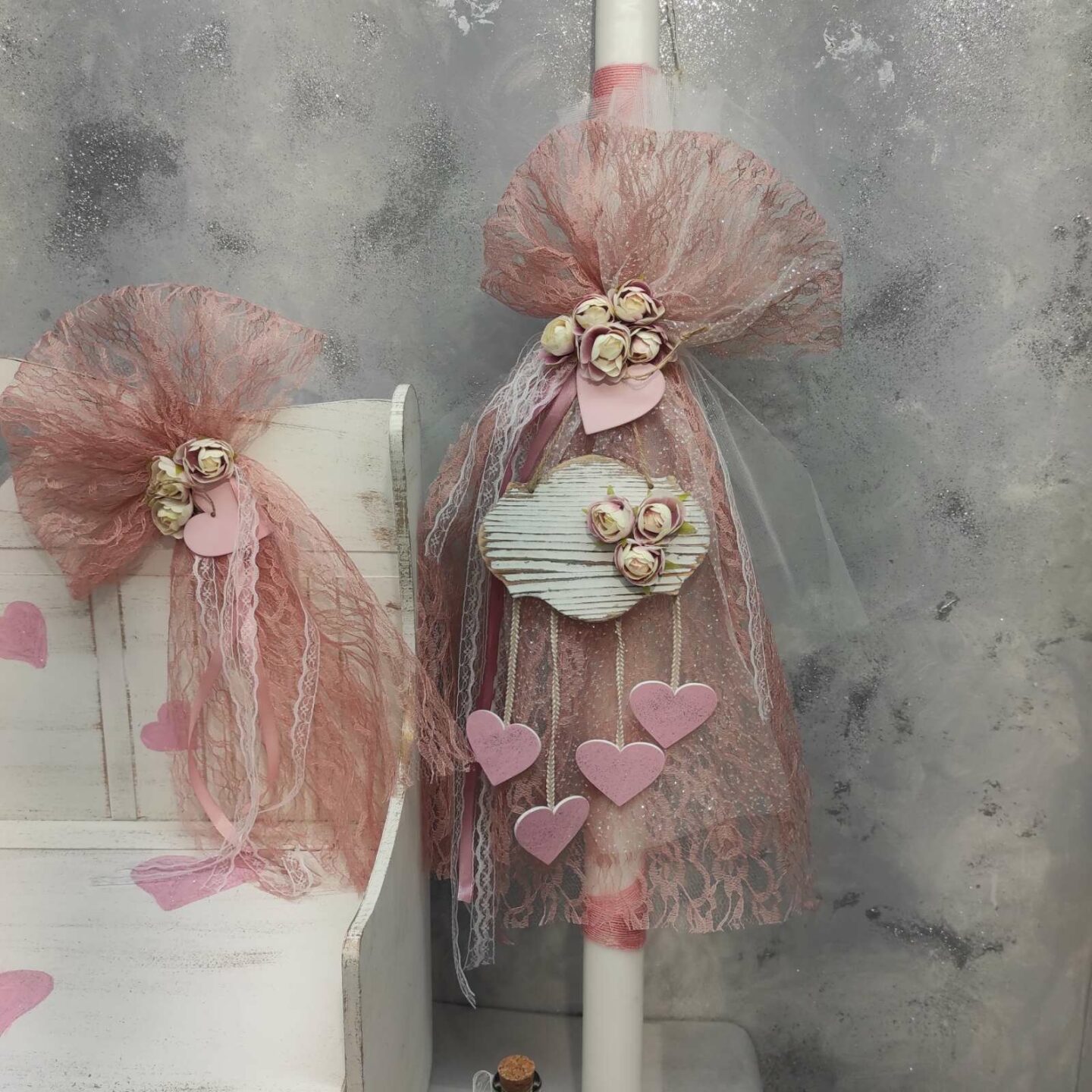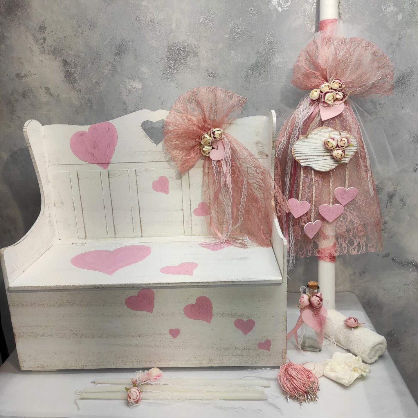 Πλήρες σετ βάπτισης. Το σετ περιλαμβάνει στολισμένο και ζωγραφισμένο ξύλινο παγκάκι και κουτί αποθήκευσης, στολισμό λαμπάδας (δεν συμπεριλαμβάνεται το κερί), λαδόπανα, 50 μαρτυρικά, στολισμένο μπουκαλάκι λαδιού, 3 κεράκια στολισμένα και πετσέτα παπά