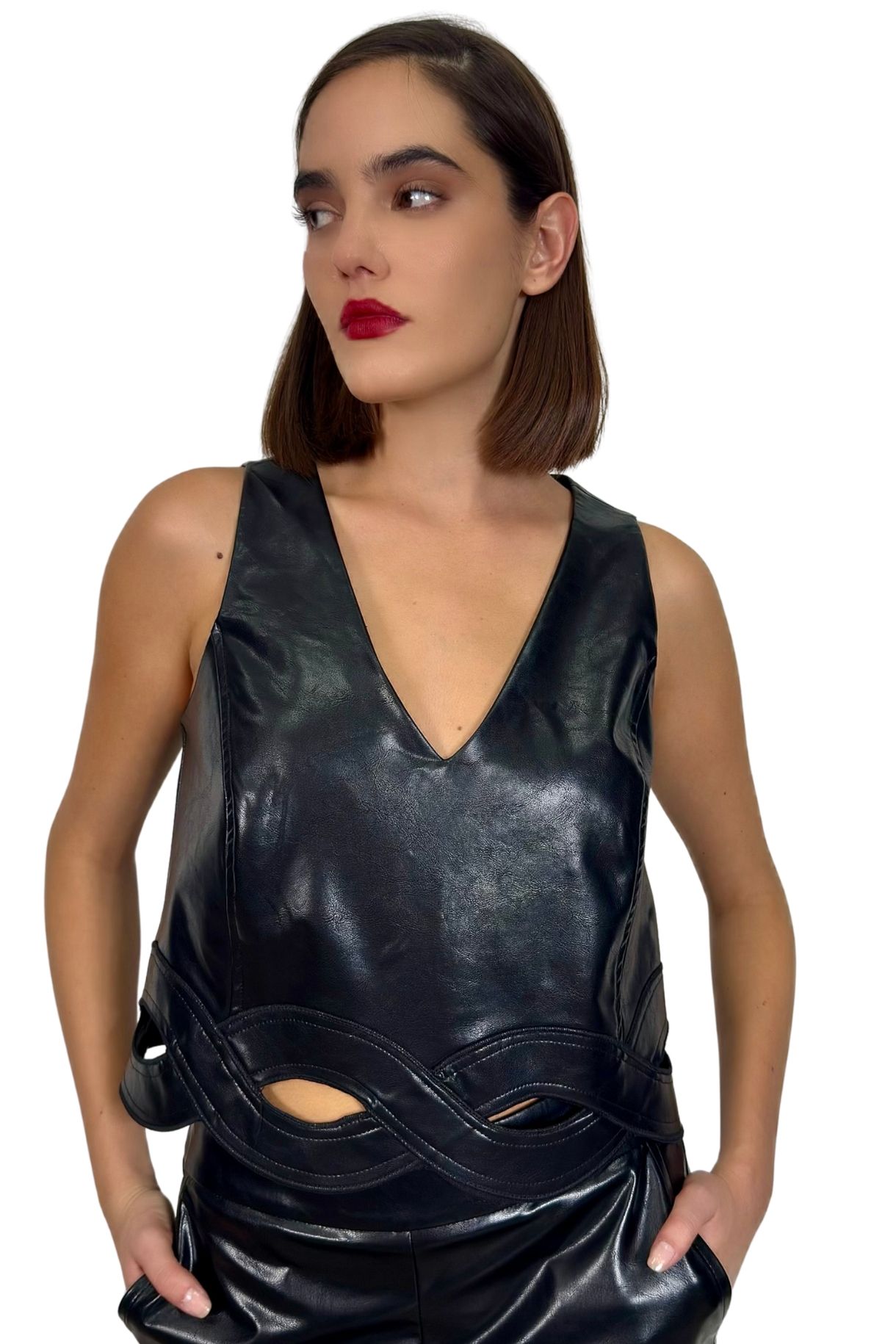 Παντελόνι με βολάν στο τελείωμα και δύο τσέπες. Διαθέτει λάστιχο στο πίσω μέρος για καλύτερη εφαρμογή και φερμουάρ στο πλάι. Είναι δερματίνη και είναι ελληνικής κατασκευής.