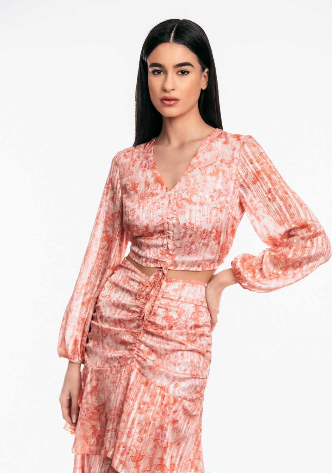 - Σετ φλοράλ με φούστα και τοπ. Το τοπ είναι μακρυμάνικο με σούρα και η φούστα κάνει σούρα στην μέση