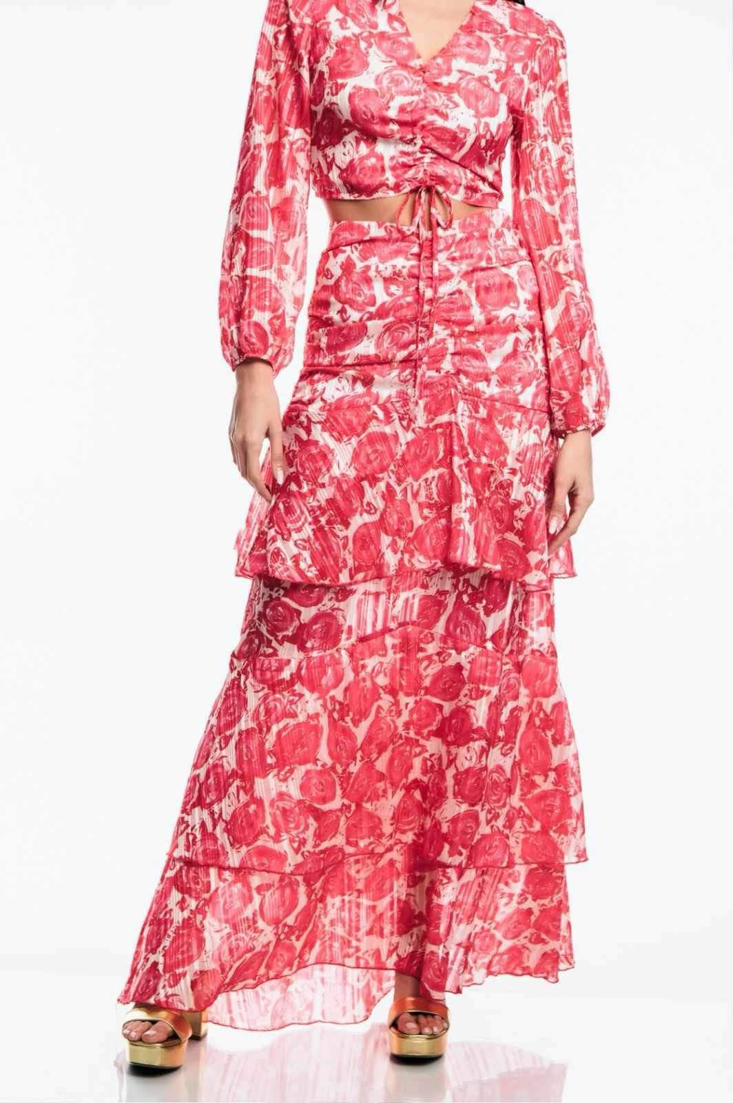 Σετ φλοράλ με φούστα και τοπ. Το τοπ είναι μακρυμάνικο με σούρα και η φούστα κάνει σούρα στην μέση