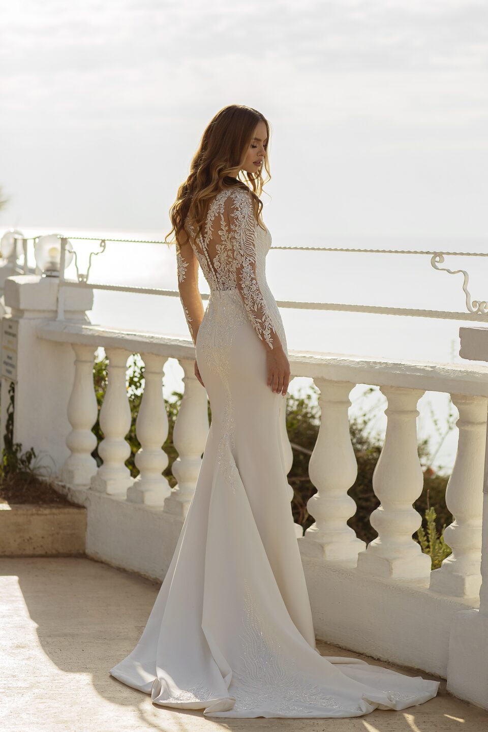 Σικ εντυπωσιακό νυφικό με γκλίτερ. Το νυφικό κάνει V στο στήθος με ένα αρκετά εντυπωσιακό σχέδιο με γκλίτερ και διαφάνεια. Διαθέτει μανίκια στο ίδιο στυλ και ανοίγει προς τα κάτω με μια διακριτική ουρά. Ιδανικό για πολιτικό και θρησκευτικό γάμο. Κανονική εφαρμογή