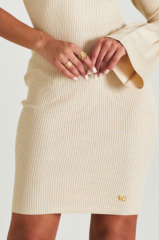 Φόρεμα με έναν ώμο και φτερά. Έχει ελαστικό ύφασμα και χιαστή λαιμόκομψη. Διαθέτει φτερά στα μανίκια