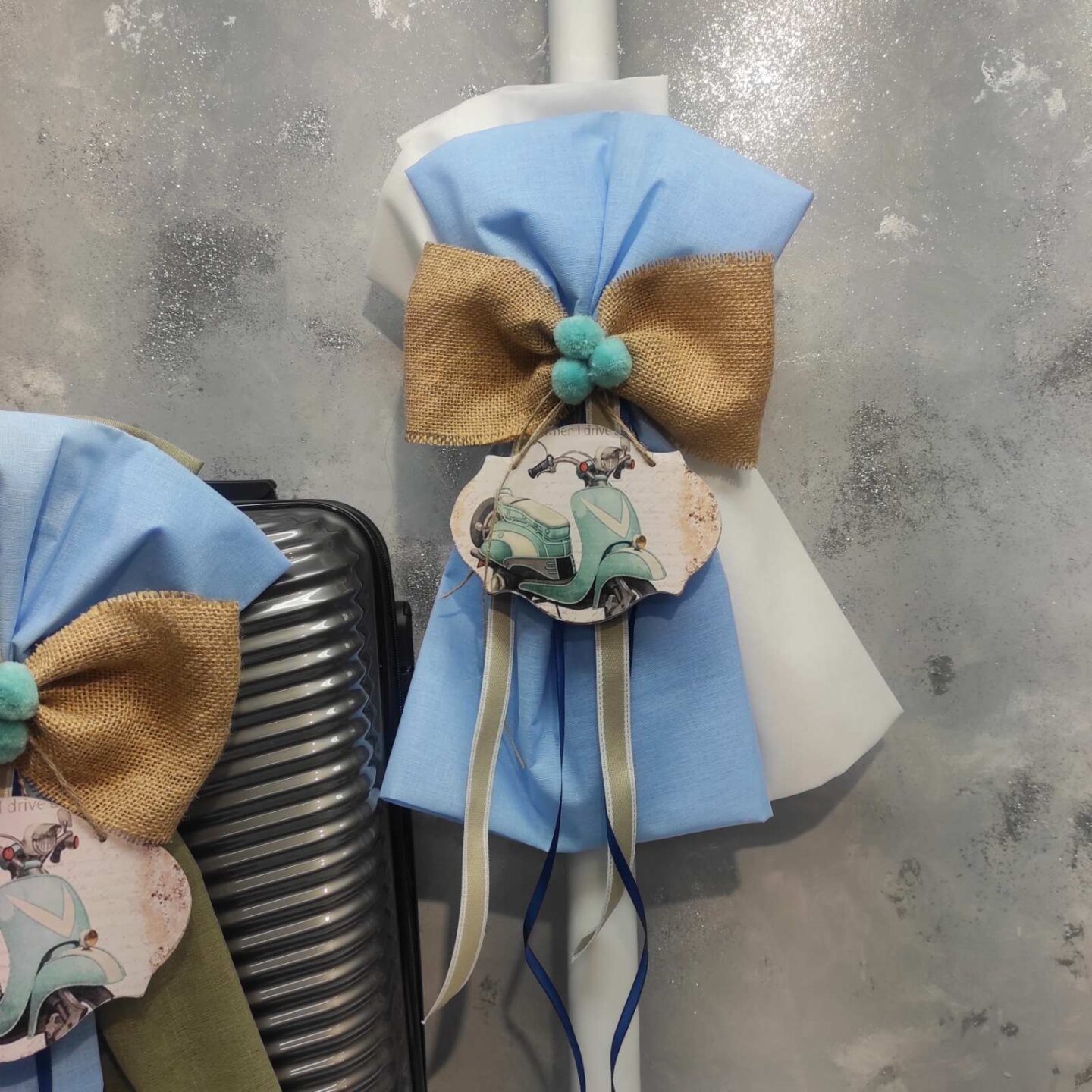 Πλήρες σετ βάπτισης μηχανή. Το σετ περιλαμβάνει στολισμένη τροχήλατη βαλίτσα ταξιδίου, στολισμό λαμπάδας (δεν συμπεριλαμβάνεται το κερί), μπουκαλάκι λαδιού, 3 κεράκια κολυμπήθρας, σαπουνάκι, λαδοσέτ, πετσέτα παππά και 50 μαρτυρικά.
