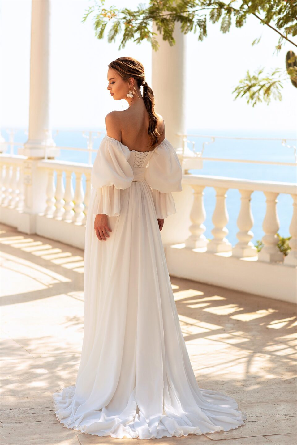 Boho μεταξωτό νυφικό με υπέροχα μανίκια και πλούσια ζώνη.  Στράπλες μπούστο με cups και μακρύ μανίκι balloon με ανοιχτούς ώμους, μια ιδιαίτερη λεπτομέρεια που το κάνει να διαφέρει. Ψιλόμεση φούστα σε Άλφα γραμμή με ουρά. Κανονική εφαρμογή