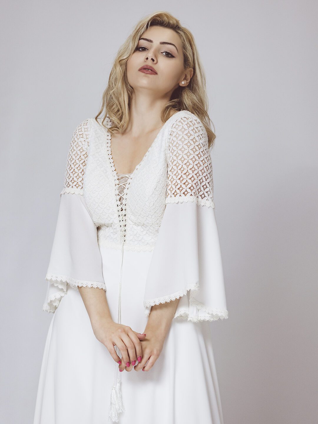 Boho chic νυφικό φόρεμα σε κρεπ, με ανάγλυφη βαμβακερή δαντέλα στο μπούστο, την πλάτη και το μανίκι. Υπέροχη πλάτη με διαφανή δαντέλα και άνοιγμα V. Σε άλφα γραμμή, ψιλόμεσο και με αέρινο μανίκι. Κανονική εφαρμογή.  Ιδανικό για πολιτικό γάμο αλλά και σε εκκλησία! Το μοντέλο φοράει Medium. Ελληνικής ραφής