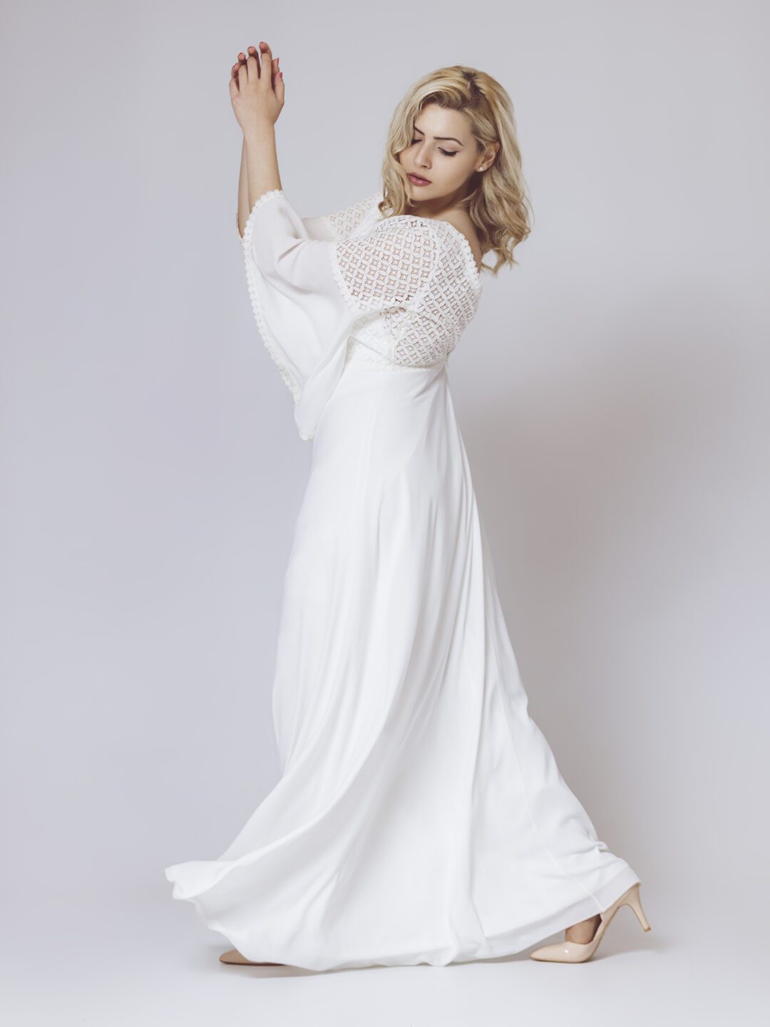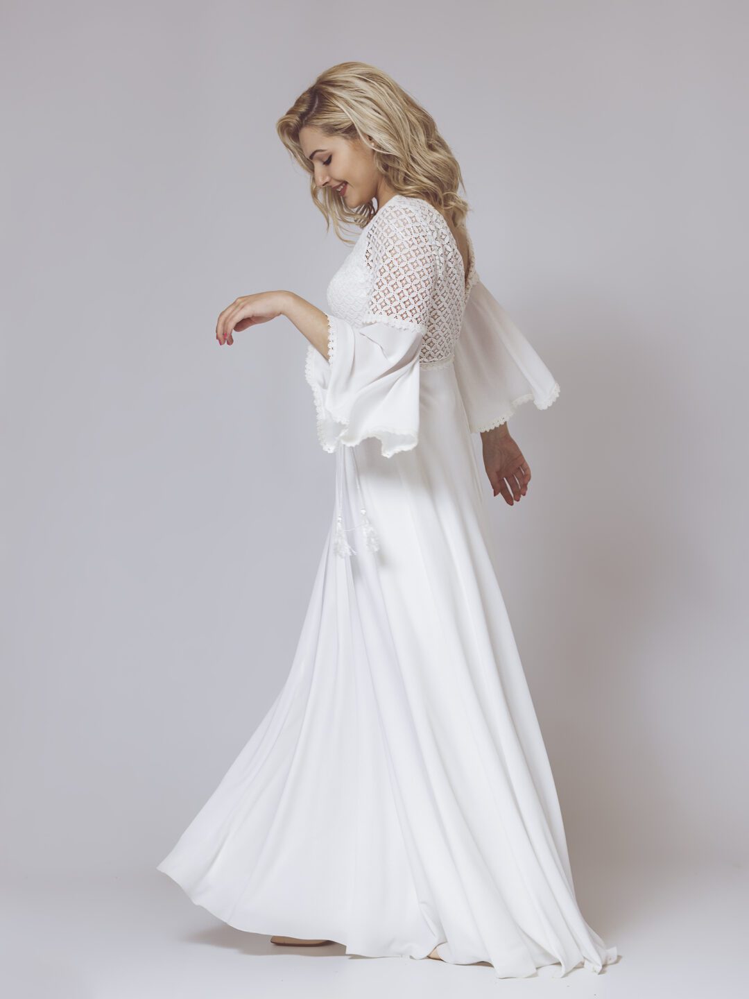 Boho chic νυφικό φόρεμα σε κρεπ, με ανάγλυφη βαμβακερή δαντέλα στο μπούστο, την πλάτη και το μανίκι. Υπέροχη πλάτη με διαφανή δαντέλα και άνοιγμα V. Σε άλφα γραμμή, ψιλόμεσο και με αέρινο μανίκι. Κανονική εφαρμογή.  Ιδανικό για πολιτικό γάμο αλλά και σε εκκλησία!